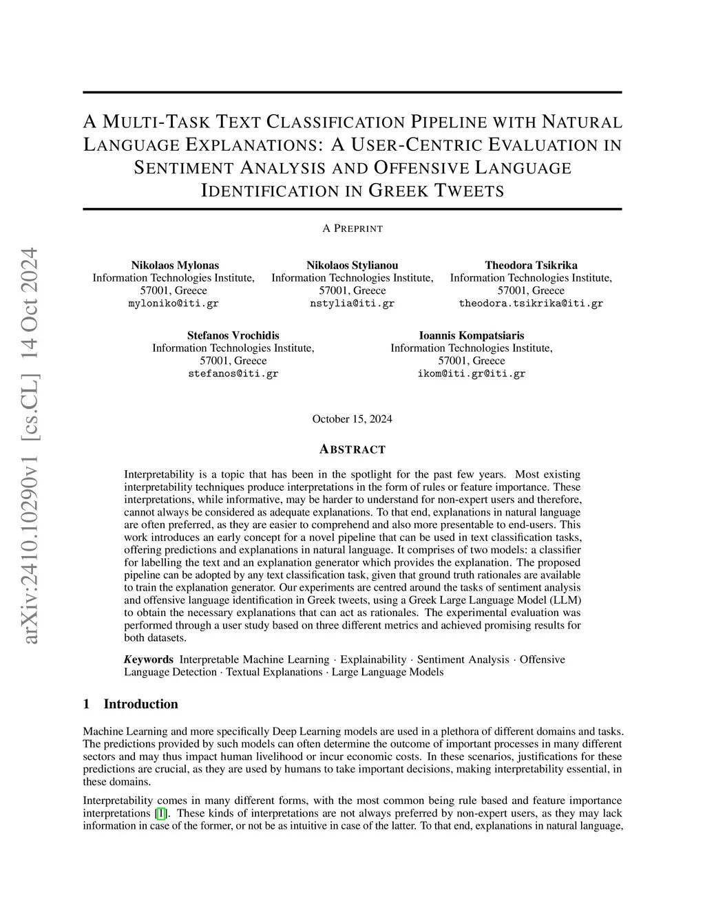 Interpretability is a topic that has been in the spotlight for the past few years. Most existing interpretability techniques produce interpretations in the form of rules or feature importance. These interpretations, while informative, may be harder to understand for non-expert users and therefore, cannot always be considered as adequate explanations. To that end, explanations in natural language are often preferred, as they are easier to comprehend and also more presentable to end-users. This work introduces an early concept for a novel pipeline that can be used in text classification tasks, offering predictions and explanations in natural language. It comprises of two models: a classifier for labelling the text and an explanation generator which provides the explanation. The proposed pipeline can be adopted by any text classification task, given that ground truth rationales are available to train the explanation generator. Our experiments are centred around the tasks of sentiment analysis and offensive language identification in Greek tweets, using a Greek Large Language Model (LLM) to obtain the necessary explanations that can act as rationales. The experimental evaluation was performed through a user study based on three different metrics and achieved promising results for both datasets.