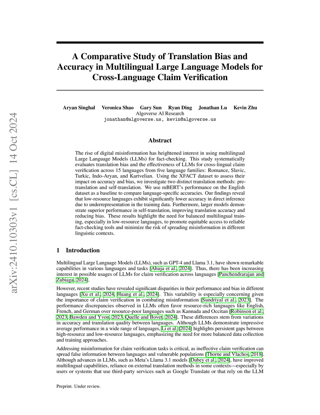 The rise of digital misinformation has heightened interest in using multilingual Large Language Models (LLMs) for fact-checking. This study systematically evaluates translation bias and the effectiveness of LLMs for cross-lingual claim verification across 15 languages from five language families: Romance, Slavic, Turkic, Indo-Aryan, and Kartvelian. Using the XFACT dataset to assess their impact on accuracy and bias, we investigate two distinct translation methods: pre-translation and self-translation. We use mBERT's performance on the English dataset as a baseline to compare language-specific accuracies. Our findings reveal that low-resource languages exhibit significantly lower accuracy in direct inference due to underrepresentation in the training data. Furthermore, larger models demonstrate superior performance in self-translation, improving translation accuracy and reducing bias. These results highlight the need for balanced multilingual training, especially in low-resource languages, to promote equitable access to reliable fact-checking tools and minimize the risk of spreading misinformation in different linguistic contexts.