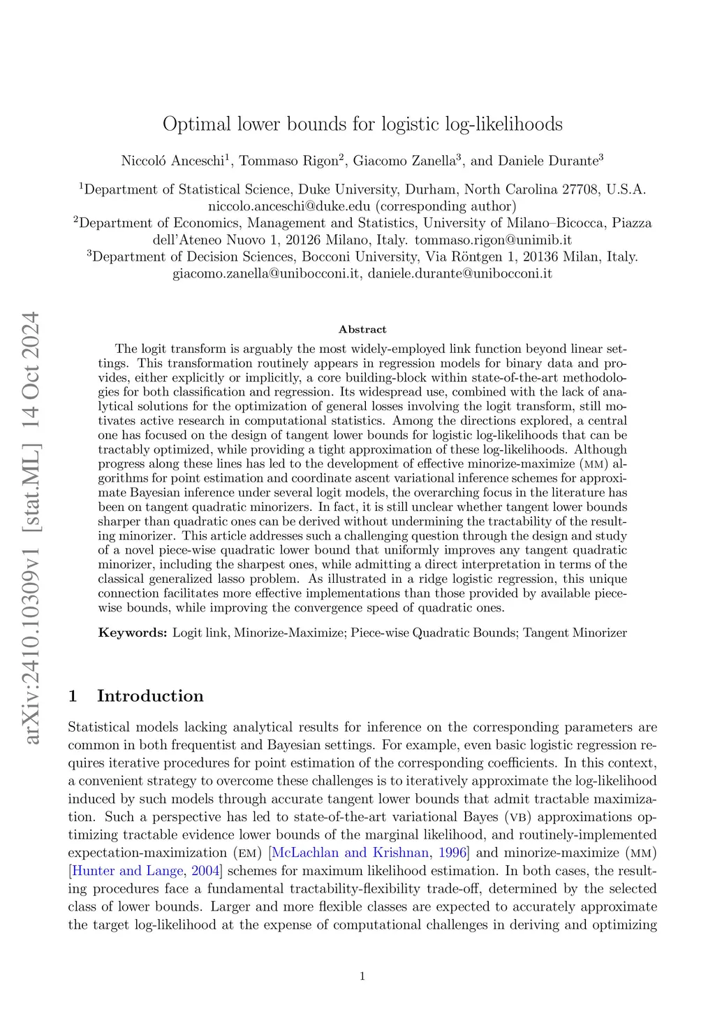 The logit transform is arguably the most widely-employed link function beyond linear settings. This transformation routinely appears in regression models for binary data and provides a central building-block in popular methods for both classification and regression. Its widespread use, combined with the lack of analytical solutions for the optimization of objective functions involving the logit transform, still motivates active research in computational statistics. Among the directions explored, a central one has focused on the design of tangent lower bounds for logistic log-likelihoods that can be tractably optimized, while providing a tight approximation of these log-likelihoods. This has led to the development of effective minorize-maximize (MM) algorithms for point estimation, and variational schemes for approximate Bayesian inference under several logit models. However, the overarching focus has been on tangent quadratic minorizers. In fact, it is still unclear whether tangent lower bounds sharper than quadratic ones can be derived without undermining the tractability of the resulting minorizer. This article addresses such a question through the design and study of a novel piece-wise quadratic lower bound that uniformly improves any tangent quadratic minorizer, including the sharpest ones, while admitting a direct interpretation in terms of the classical generalized lasso problem. As illustrated in realistic empirical studies, such a sharper bound not only improves the speed of convergence of common MM schemes for penalized maximum likelihood estimation, but also yields tractable variational Bayes (VB) approximations with higher accuracy relative to those obtained under popular quadratic bounds employed in VB.