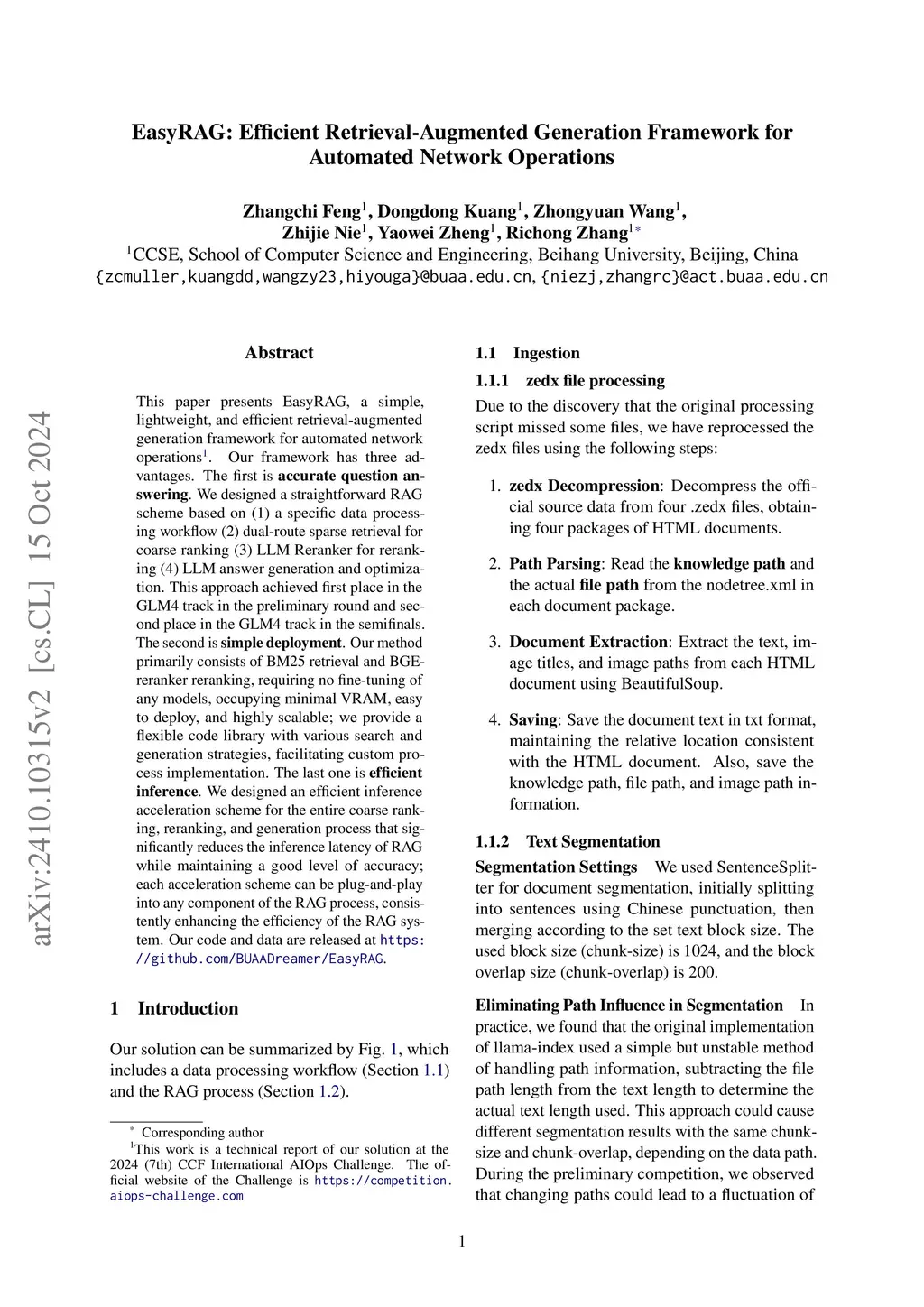 This paper presents EasyRAG, a simple, lightweight, and efficient retrieval-augmented generation framework for automated network operations. Our framework has three advantages. The first is accurate question answering. We designed a straightforward RAG scheme based on (1) a specific data processing workflow (2) dual-route sparse retrieval for coarse ranking (3) LLM Reranker for reranking (4) LLM answer generation and optimization. This approach achieved first place in the GLM4 track in the preliminary round and second place in the GLM4 track in the semifinals. The second is simple deployment. Our method primarily consists of BM25 retrieval and BGE-reranker reranking, requiring no fine-tuning of any models, occupying minimal VRAM, easy to deploy, and highly scalable; we provide a flexible code library with various search and generation strategies, facilitating custom process implementation. The last one is efficient inference. We designed an efficient inference acceleration scheme for the entire coarse ranking, reranking, and generation process that significantly reduces the inference latency of RAG while maintaining a good level of accuracy; each acceleration scheme can be plug-and-play into any component of the RAG process, consistently enhancing the efficiency of the RAG system. Our code and data are released at \url{https://github.com/BUAADreamer/EasyRAG}.