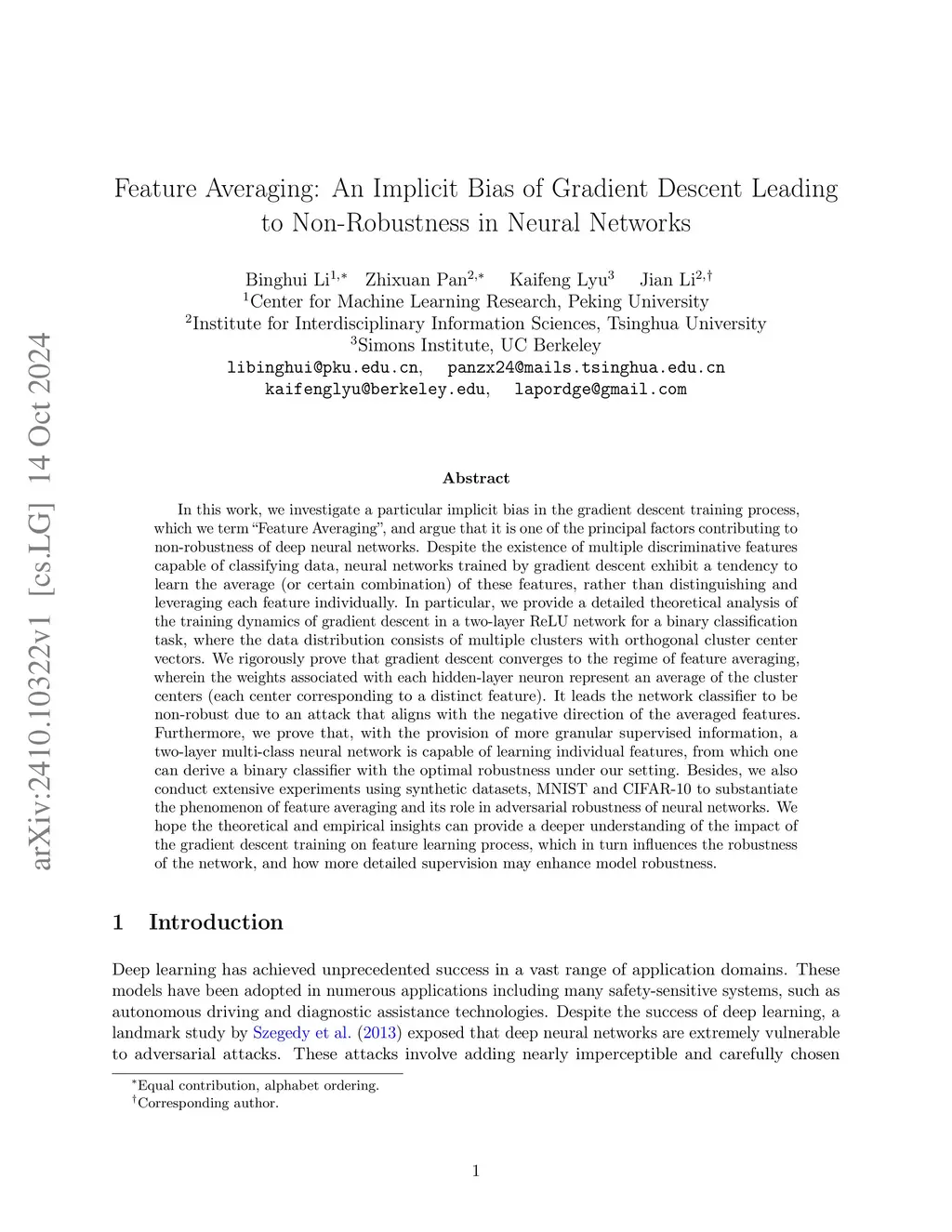 Feature Averaging: An Implicit Bias of Gradient Descent Leading to Non-Robustness in Neural Networks