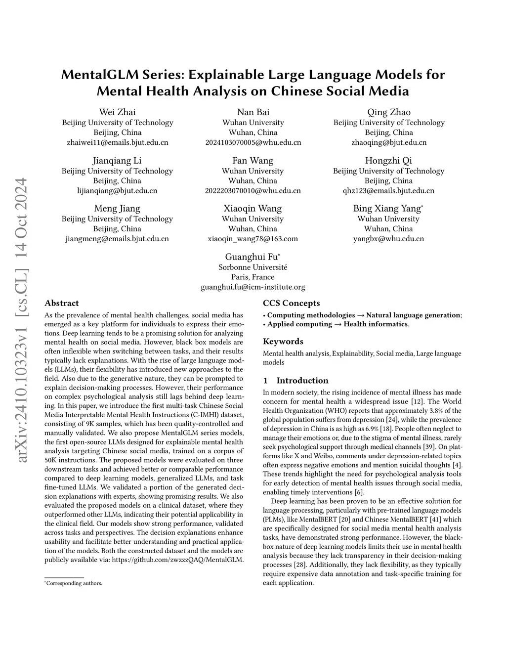 As the prevalence of mental health challenges, social media has emerged as a key platform for individuals to express their emotions.Deep learning tends to be a promising solution for analyzing mental health on social media. However, black box models are often inflexible when switching between tasks, and their results typically lack explanations. With the rise of large language models (LLMs), their flexibility has introduced new approaches to the field. Also due to the generative nature, they can be prompted to explain decision-making processes. However, their performance on complex psychological analysis still lags behind deep learning. In this paper, we introduce the first multi-task Chinese Social Media Interpretable Mental Health Instructions (C-IMHI) dataset, consisting of 9K samples, which has been quality-controlled and manually validated. We also propose MentalGLM series models, the first open-source LLMs designed for explainable mental health analysis targeting Chinese social media, trained on a corpus of 50K instructions. The proposed models were evaluated on three downstream tasks and achieved better or comparable performance compared to deep learning models, generalized LLMs, and task fine-tuned LLMs. We validated a portion of the generated decision explanations with experts, showing promising results. We also evaluated the proposed models on a clinical dataset, where they outperformed other LLMs, indicating their potential applicability in the clinical field. Our models show strong performance, validated across tasks and perspectives. The decision explanations enhance usability and facilitate better understanding and practical application of the models. Both the constructed dataset and the models are publicly available via: https://github.com/zwzzzQAQ/MentalGLM.
