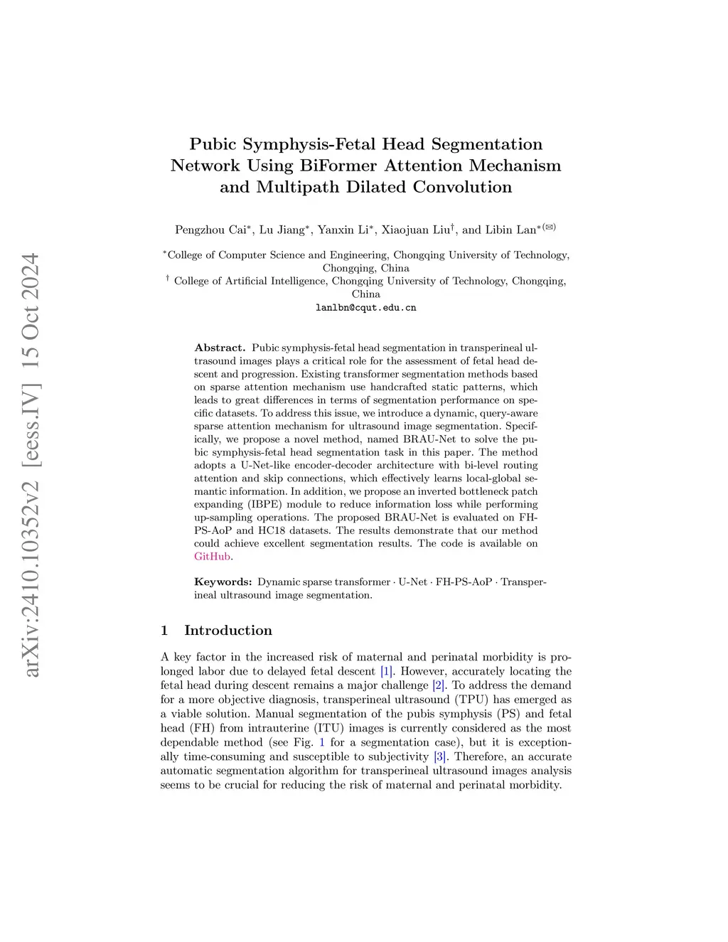 Pubic Symphysis-Fetal Head Segmentation Network Using BiFormer Attention