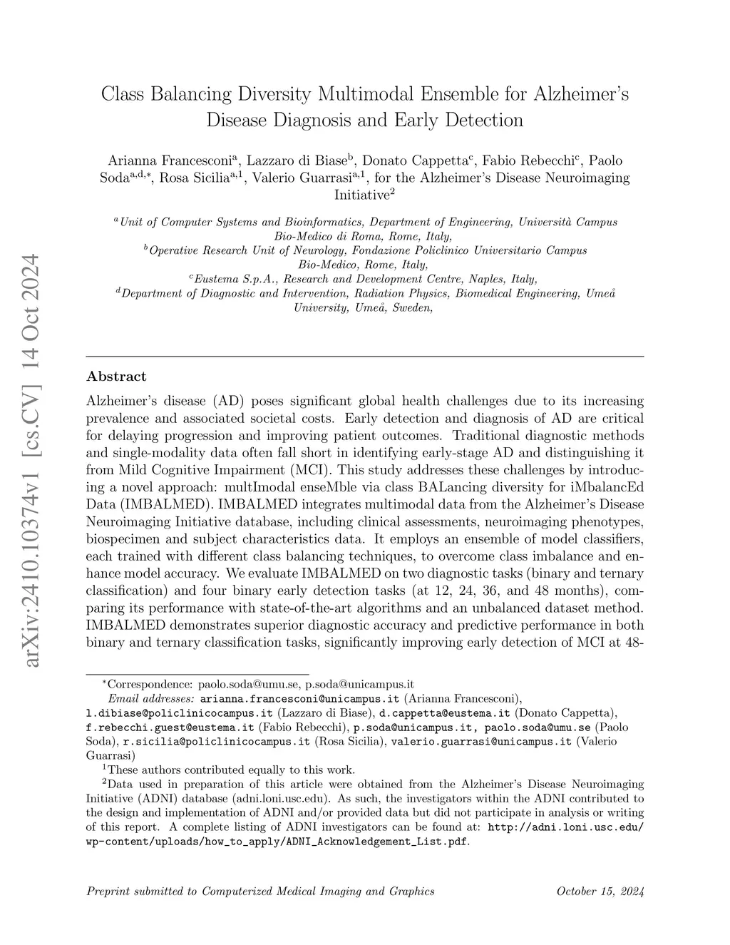 Class Balancing Diversity Multimodal Ensemble for Alzheimer's Disease