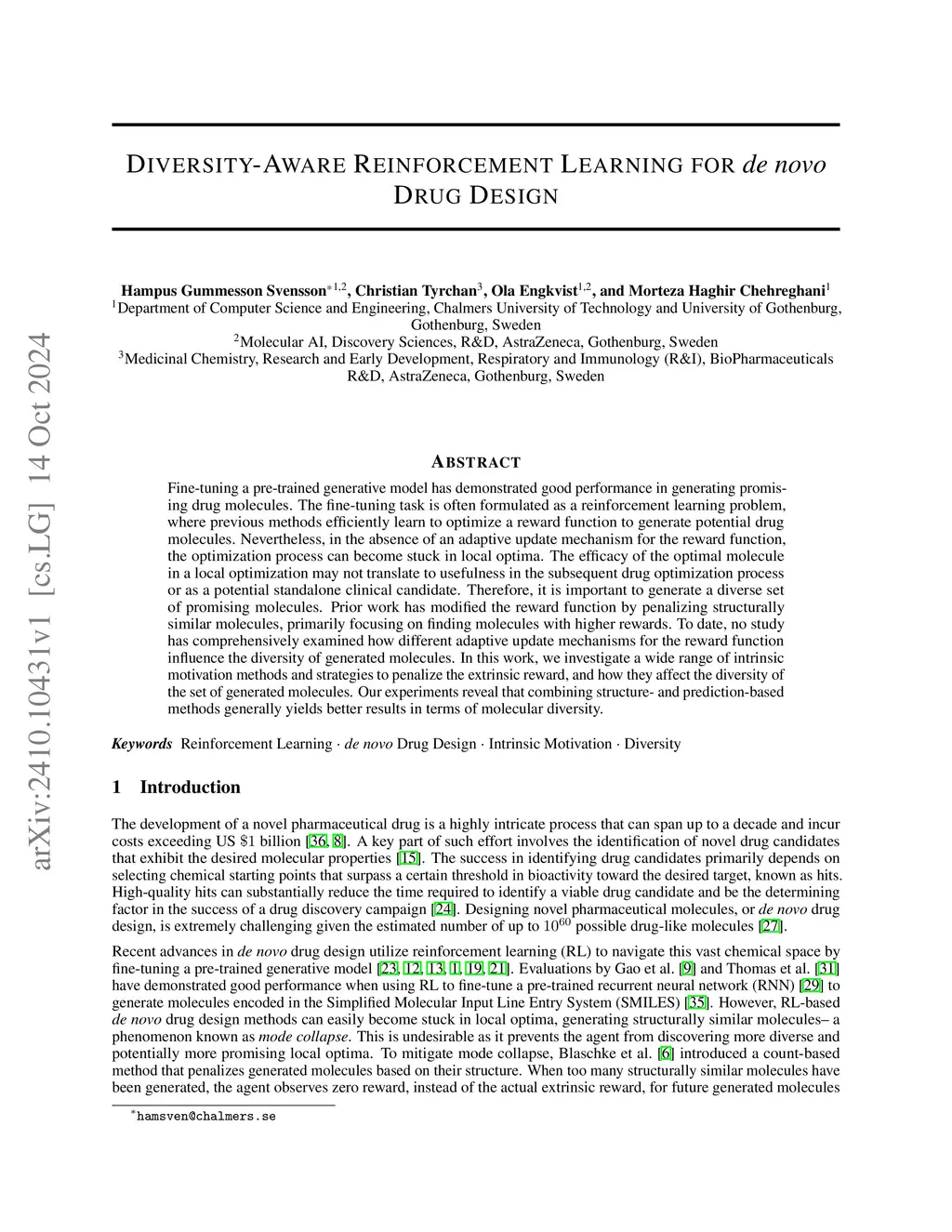 Diversity-Aware Reinforcement Learning for de novo Drug Design