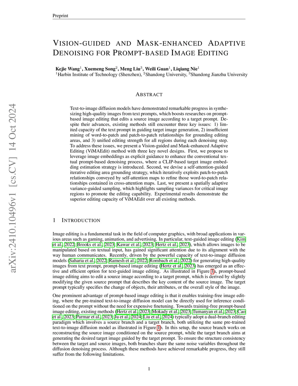 Text-to-image diffusion models have demonstrated remarkable progress in synthesizing high-quality images from text prompts, which boosts researches on prompt-based image editing that edits a source image according to a target prompt. Despite their advances, existing methods still encounter three key issues: 1) limited capacity of the text prompt in guiding target image generation, 2) insufficient mining of word-to-patch and patch-to-patch relationships for grounding editing areas, and 3) unified editing strength for all regions during each denoising step. To address these issues, we present a Vision-guided and Mask-enhanced Adaptive Editing (ViMAEdit) method with three key novel designs. First, we propose to leverage image embeddings as explicit guidance to enhance the conventional textual prompt-based denoising process, where a CLIP-based target image embedding estimation strategy is introduced. Second, we devise a self-attention-guided iterative editing area grounding strategy, which iteratively exploits patch-to-patch relationships conveyed by self-attention maps to refine those word-to-patch relationships contained in cross-attention maps. Last, we present a spatially adaptive variance-guided sampling, which highlights sampling variances for critical image regions to promote the editing capability. Experimental results demonstrate the superior editing capacity of ViMAEdit over all existing methods.
