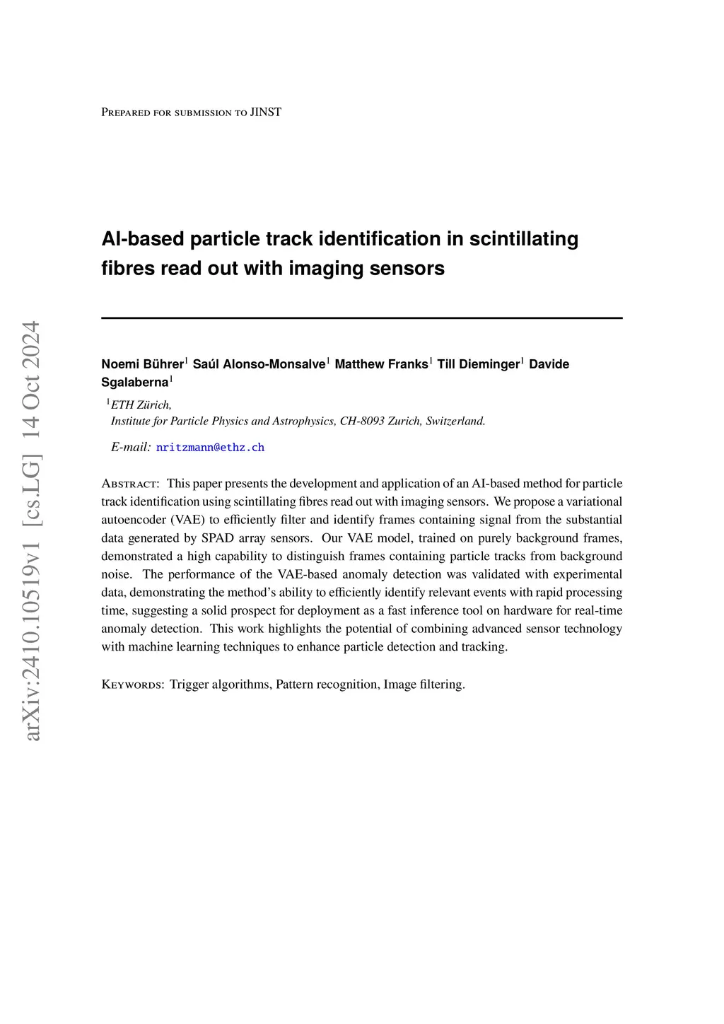 This paper presents the development and application of an AI-based method for particle track identification using scintillating fibres read out with imaging sensors. We propose a variational autoencoder (VAE) to efficiently filter and identify frames containing signal from the substantial data generated by SPAD array sensors. Our VAE model, trained on purely background frames, demonstrated a high capability to distinguish frames containing particle tracks from background noise. The performance of the VAE-based anomaly detection was validated with experimental data, demonstrating the method's ability to efficiently identify relevant events with rapid processing time, suggesting a solid prospect for deployment as a fast inference tool on hardware for real-time anomaly detection. This work highlights the potential of combining advanced sensor technology with machine learning techniques to enhance particle detection and tracking.
