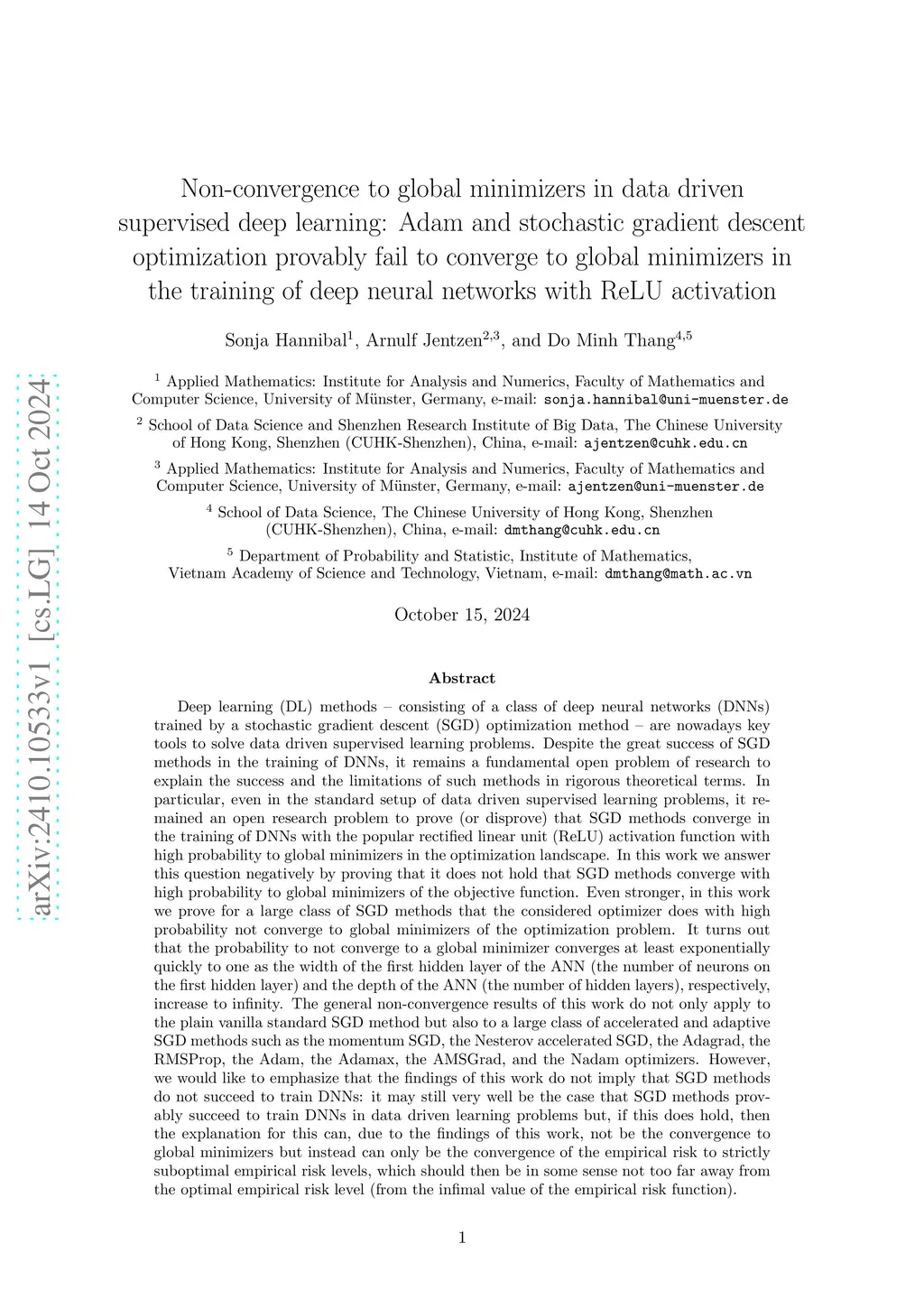 Deep learning methods - consisting of a class of deep neural networks (DNNs) trained by a stochastic gradient descent (SGD) optimization method - are nowadays key tools to solve data driven supervised learning problems. Despite the great success of SGD methods in the training of DNNs, it remains a fundamental open problem of research to explain the success and the limitations of such methods in rigorous theoretical terms. In particular, even in the standard setup of data driven supervised learning problems, it remained an open research problem to prove (or disprove) that SGD methods converge in the training of DNNs with the popular rectified linear unit (ReLU) activation function with high probability to global minimizers in the optimization landscape. In this work we answer this question negatively. Specifically, in this work we prove for a large class of SGD methods that the considered optimizer does with high probability not converge to global minimizers of the optimization problem. It turns out that the probability to not converge to a global minimizer converges at least exponentially quickly to one as the width of the first hidden layer of the ANN and the depth of the ANN, respectively, increase. The general non-convergence results of this work do not only apply to the plain vanilla standard SGD method but also to a large class of accelerated and adaptive SGD methods such as the momentum SGD, the Nesterov accelerated SGD, the Adagrad, the RMSProp, the Adam, the Adamax, the AMSGrad, and the Nadam optimizers.