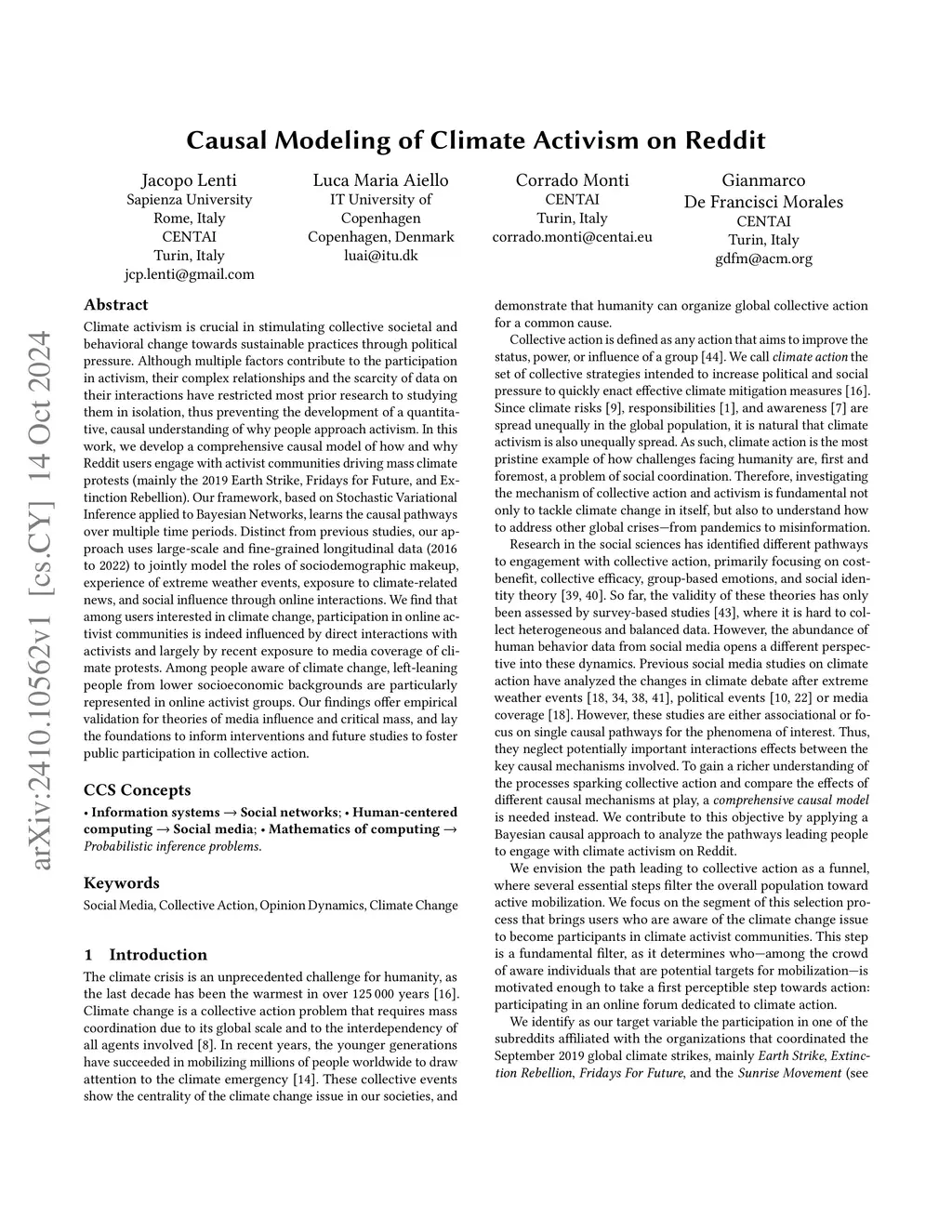 Climate activism is crucial in stimulating collective societal and behavioral change towards sustainable practices through political pressure. Although multiple factors contribute to the participation in activism, their complex relationships and the scarcity of data on their interactions have restricted most prior research to studying them in isolation, thus preventing the development of a quantitative, causal understanding of why people approach activism. In this work, we develop a comprehensive causal model of how and why Reddit users engage with activist communities driving mass climate protests (mainly the 2019 Earth Strike, Fridays for Future, and Extinction Rebellion). Our framework, based on Stochastic Variational Inference applied to Bayesian Networks, learns the causal pathways over multiple time periods. Distinct from previous studies, our approach uses large-scale and fine-grained longitudinal data (2016 to 2022) to jointly model the roles of sociodemographic makeup, experience of extreme weather events, exposure to climate-related news, and social influence through online interactions. We find that among users interested in climate change, participation in online activist communities is indeed influenced by direct interactions with activists and largely by recent exposure to media coverage of climate protests. Among people aware of climate change, left-leaning people from lower socioeconomic backgrounds are particularly represented in online activist groups. Our findings offer empirical validation for theories of media influence and critical mass, and lay the foundations to inform interventions and future studies to foster public participation in collective action.