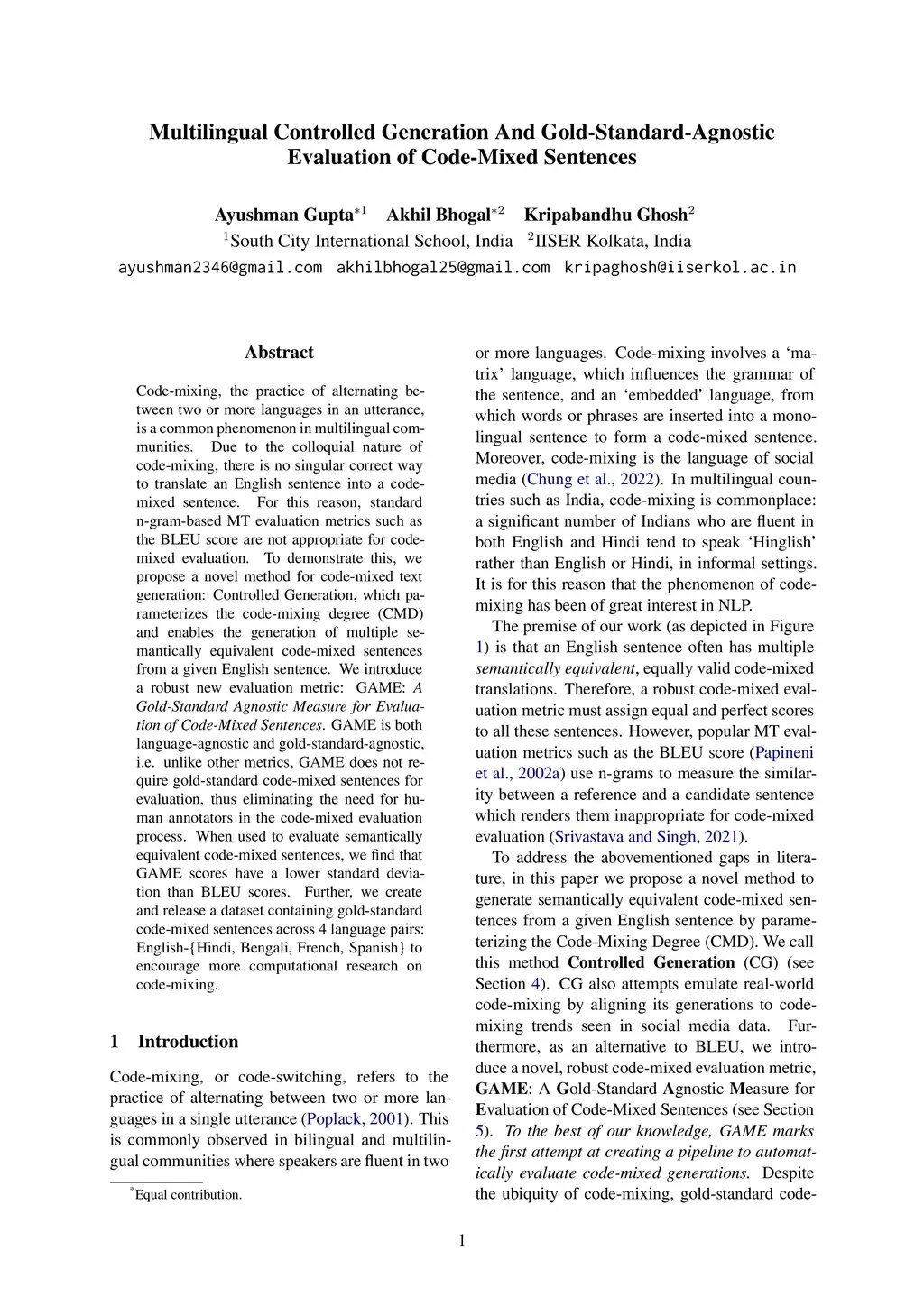 Code-mixing, the practice of alternating between two or more languages in an utterance, is a common phenomenon in multilingual communities. Due to the colloquial nature of code-mixing, there is no singular correct way to translate an English sentence into a code-mixed sentence. For this reason, standard n-gram-based MT evaluation metrics such as the BLEU score are not appropriate for code-mixed evaluation. To demonstrate this, we propose a novel method for code-mixed text generation: Controlled Generation, which parameterizes the code-mixing degree (CMD) and enables the generation of multiple semantically equivalent code-mixed sentences from a given English sentence. We introduce a robust new evaluation metric: GAME: A Gold-Standard Agnostic Measure for Evaluation of Code-Mixed Sentences. GAME is both language-agnostic and gold-standard-agnostic, i.e. unlike other metrics, GAME does not require gold-standard code-mixed sentences for evaluation, thus eliminating the need for human annotators in the code-mixed evaluation process. When used to evaluate semantically equivalent code-mixed sentences, we find that GAME scores have a lower standard deviation than BLEU scores. Further, we create and release a dataset containing gold-standard code-mixed sentences across 4 language pairs: English-{Hindi, Bengali, French, Spanish} to encourage more computational research on code-mixing.