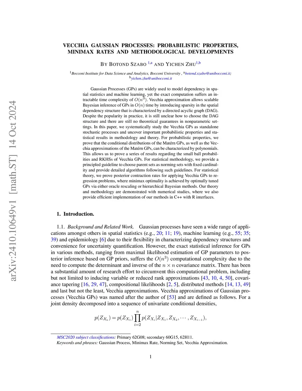 Gaussian Processes (GPs) are widely used to model dependency in spatial statistics and machine learning, yet the exact computation suffers an intractable time complexity of . Vecchia approximation allows scalable Bayesian inference of GPs in time by introducing sparsity in the spatial dependency structure that is characterized by a directed acyclic graph (DAG). Despite the popularity in practice, it is still unclear how to choose the DAG structure and there are still no theoretical guarantees in nonparametric settings. In this paper, we systematically study the Vecchia GPs as standalone stochastic processes and uncover important probabilistic properties and statistical results in methodology and theory. For probabilistic properties, we prove that the conditional distributions of the Mat\'{e}rn GPs, as well as the Vecchia approximations of the Mat\'{e}rn GPs, can be characterized by polynomials. This allows us to prove a series of results regarding the small ball probabilities and RKHSs of Vecchia GPs. For statistical methodology, we provide a principled guideline to choose parent sets as norming sets with fixed cardinality and provide detailed algorithms following such guidelines. For statistical theory, we prove posterior contraction rates for applying Vecchia GPs to regression problems, where minimax optimality is achieved by optimally tuned GPs via either oracle rescaling or hierarchical Bayesian methods. Our theory and methodology are demonstrated with numerical studies, where we also provide efficient implementation of our methods in C++ with R interfaces.
