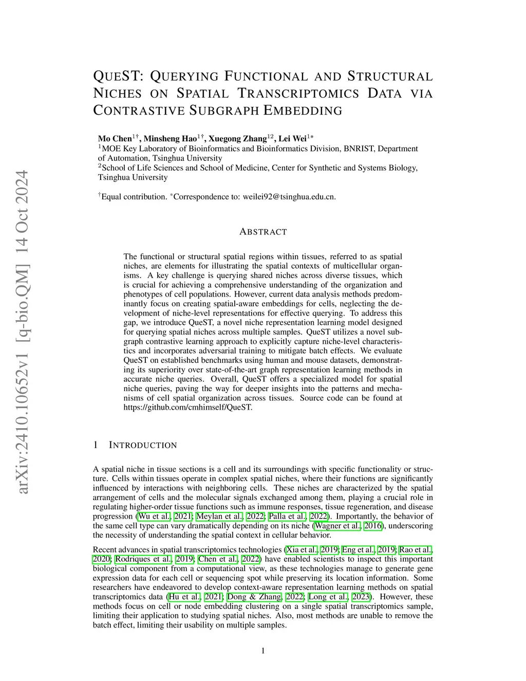 Cells in multicellular organisms coordinate to form functional and structural niches. With spatial transcriptomics enabling gene expression profiling in spatial contexts, it has been revealed that spatial niches serve as cohesive and recurrent units in physiological and pathological processes. These observations suggest universal tissue organization principles encoded by conserved niche patterns, and call for a query-based niche analytical paradigm beyond current computational tools. In this work, we defined the Niche Query Task, which is to identify similar niches across ST samples given a niche of interest (NOI). We further developed QueST, a specialized method for solving this task. QueST models each niche as a subgraph, uses contrastive learning to learn discriminative niche embeddings, and incorporates adversarial training to mitigate batch effects. In simulations and benchmark datasets, QueST outperformed existing methods repurposed for niche querying, accurately capturing niche structures in heterogeneous environments and demonstrating strong generalizability across diverse sequencing platforms. Applied to tertiary lymphoid structures in renal and lung cancers, QueST revealed functionally distinct niches associated with patient prognosis and uncovered conserved and divergent spatial architectures across cancer types. These results demonstrate that QueST enables systematic, quantitative profiling of spatial niches across samples, providing a powerful tool to dissect spatial tissue architecture in health and disease.