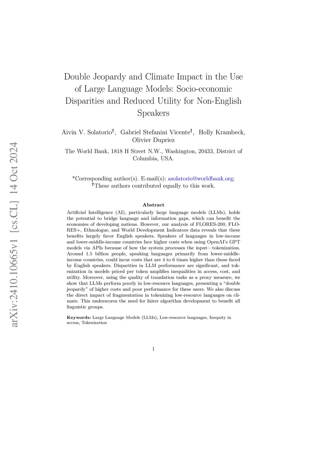 Artificial Intelligence (AI), particularly large language models (LLMs), holds the potential to bridge language and information gaps, which can benefit the economies of developing nations. However, our analysis of FLORES-200, FLORES+, Ethnologue, and World Development Indicators data reveals that these benefits largely favor English speakers. Speakers of languages in low-income and lower-middle-income countries face higher costs when using OpenAI's GPT models via APIs because of how the system processes the input -- tokenization. Around 1.5 billion people, speaking languages primarily from lower-middle-income countries, could incur costs that are 4 to 6 times higher than those faced by English speakers. Disparities in LLM performance are significant, and tokenization in models priced per token amplifies inequalities in access, cost, and utility. Moreover, using the quality of translation tasks as a proxy measure, we show that LLMs perform poorly in low-resource languages, presenting a ``double jeopardy" of higher costs and poor performance for these users. We also discuss the direct impact of fragmentation in tokenizing low-resource languages on climate. This underscores the need for fairer algorithm development to benefit all linguistic groups.