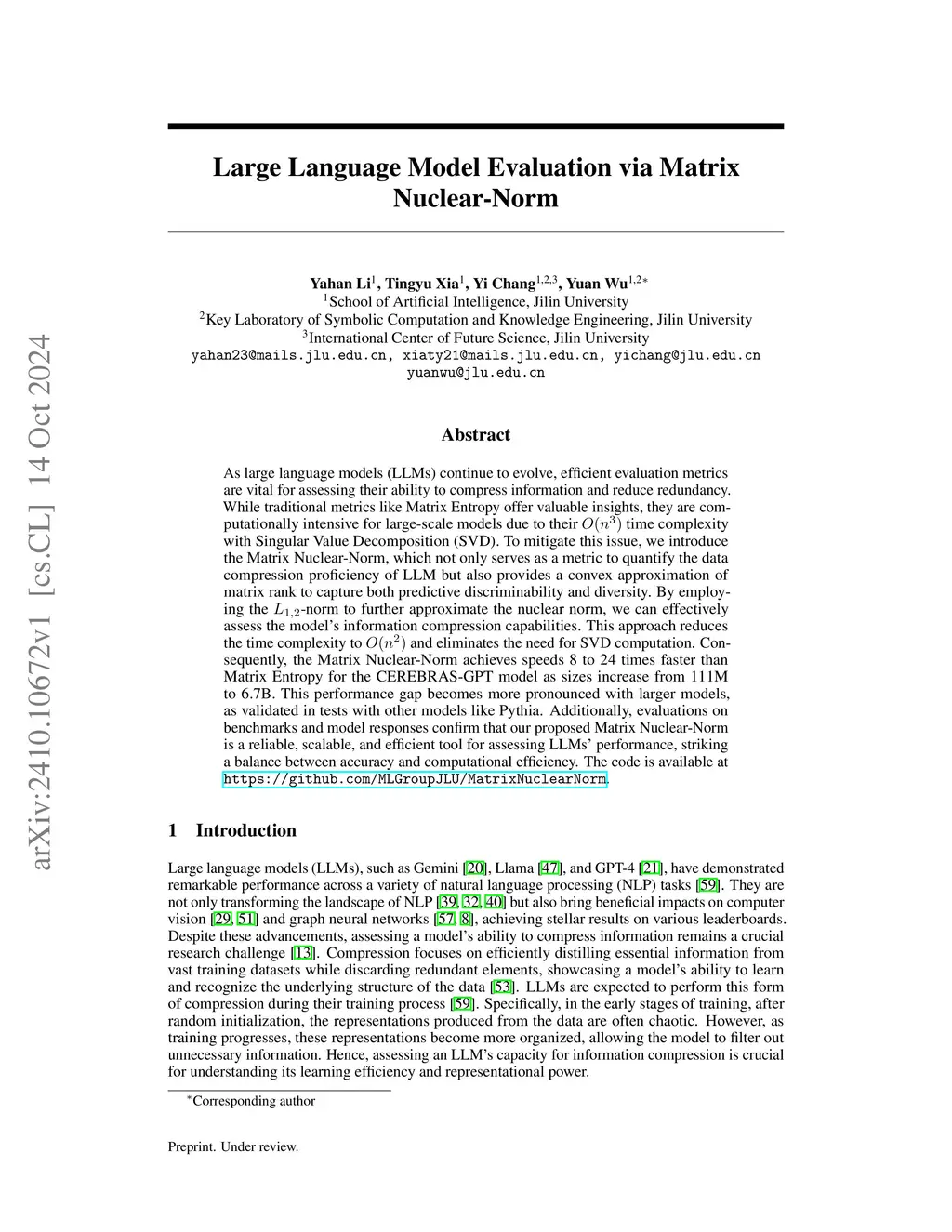 As large language models (LLMs) continue to evolve, efficient evaluation metrics are vital for assessing their ability to compress information and reduce redundancy. While traditional metrics like Matrix Entropy offer valuable insights, they are computationally intensive for large-scale models due to their \( O(n^3) \) time complexity with Singular Value Decomposition (SVD). To mitigate this issue, we introduce the Matrix Nuclear-Norm, which not only serves as a metric to quantify the data compression proficiency of LLM but also provides a convex approximation of matrix rank to capture both predictive discriminability and diversity. By employing the \( L_{1,2}\text{-norm} \) to further approximate the nuclear norm, we can effectively assess the model's information compression capabilities. This approach reduces the time complexity to \( O(n^2) \) and eliminates the need for SVD computation. Consequently, the Matrix Nuclear-Norm achieves speeds 8 to 24 times faster than Matrix Entropy for the CEREBRAS-GPT model as sizes increase from 111M to 6.7B. This performance gap becomes more pronounced with larger models, as validated in tests with other models like Pythia. Additionally, evaluations on benchmarks and model responses confirm that our proposed Matrix Nuclear-Norm is a reliable, scalable, and efficient tool for assessing LLMs' performance, striking a balance between accuracy and computational efficiency. The code is available atthis https URL.