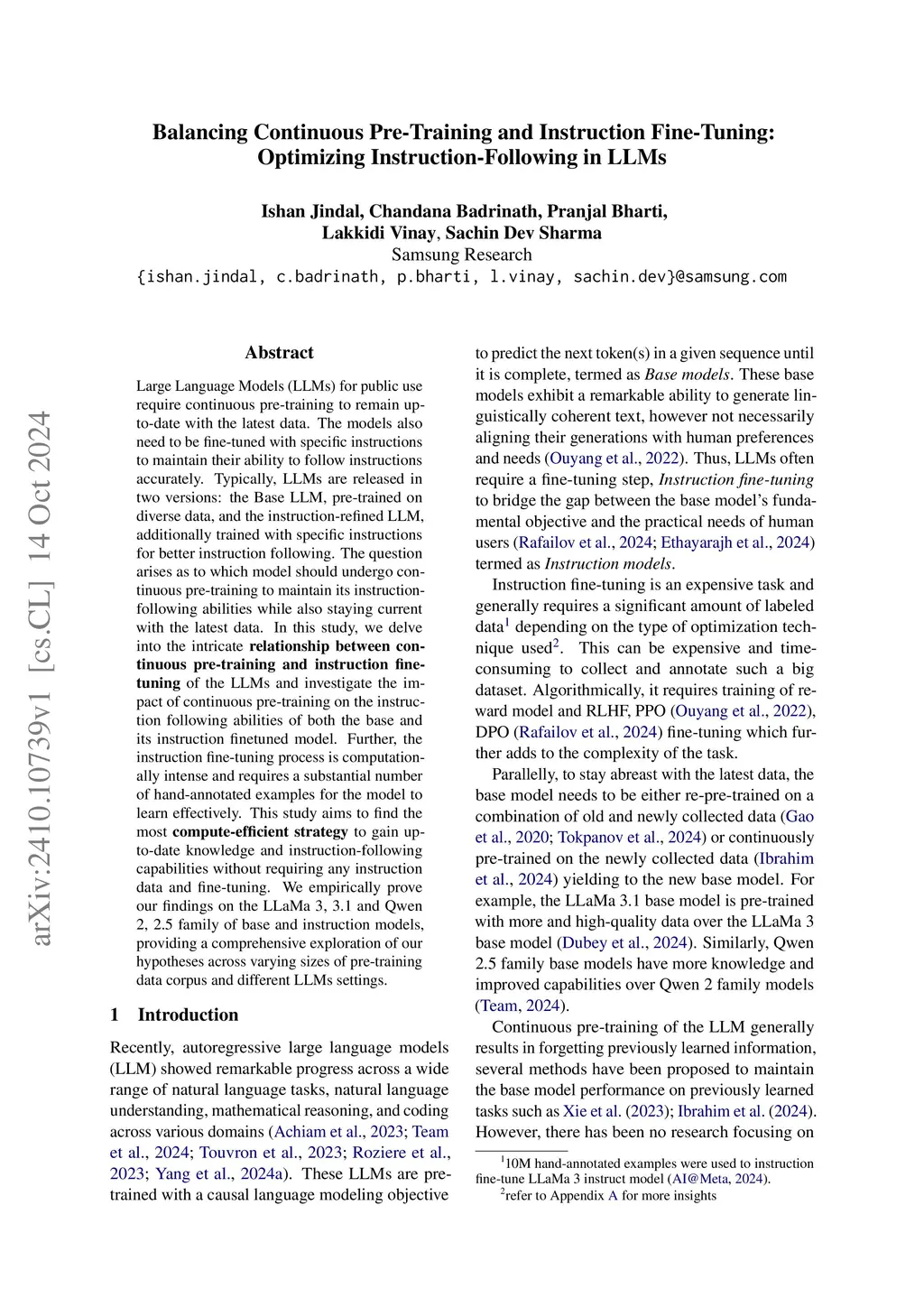 Large Language Models (LLMs) for public use require continuous pre-training to remain up-to-date with the latest data. The models also need to be fine-tuned with specific instructions to maintain their ability to follow instructions accurately. Typically, LLMs are released in two versions: the Base LLM, pre-trained on diverse data, and the instruction-refined LLM, additionally trained with specific instructions for better instruction following. The question arises as to which model should undergo continuous pre-training to maintain its instruction-following abilities while also staying current with the latest data. In this study, we delve into the intricate relationship between continuous pre-training and instruction fine-tuning of the LLMs and investigate the impact of continuous pre-training on the instruction following abilities of both the base and its instruction finetuned model. Further, the instruction fine-tuning process is computationally intense and requires a substantial number of hand-annotated examples for the model to learn effectively. This study aims to find the most compute-efficient strategy to gain up-to-date knowledge and instruction-following capabilities without requiring any instruction data and fine-tuning. We empirically prove our findings on the LLaMa 3, 3.1 and Qwen 2, 2.5 family of base and instruction models, providing a comprehensive exploration of our hypotheses across varying sizes of pre-training data corpus and different LLMs settings.