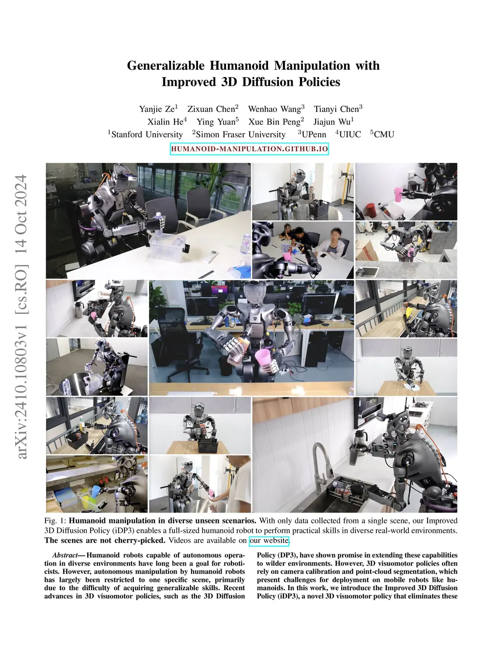Humanoid robots capable of autonomous operation in diverse environments have long been a goal for roboticists. However, autonomous manipulation by humanoid robots has largely been restricted to one specific scene, primarily due to the difficulty of acquiring generalizable skills and the expensiveness of in-the-wild humanoid robot data. In this work, we build a real-world robotic system to address this challenging problem. Our system is mainly an integration of 1) a whole-upper-body robotic teleoperation system to acquire human-like robot data, 2) a 25-DoF humanoid robot platform with a height-adjustable cart and a 3D LiDAR sensor, and 3) an improved 3D Diffusion Policy learning algorithm for humanoid robots to learn from noisy human data. We run more than 2000 episodes of policy rollouts on the real robot for rigorous policy evaluation. Empowered by this system, we show that using only data collected in one single scene and with only onboard computing, a full-sized humanoid robot can autonomously perform skills in diverse real-world scenarios. Videos are available atthis https URL.