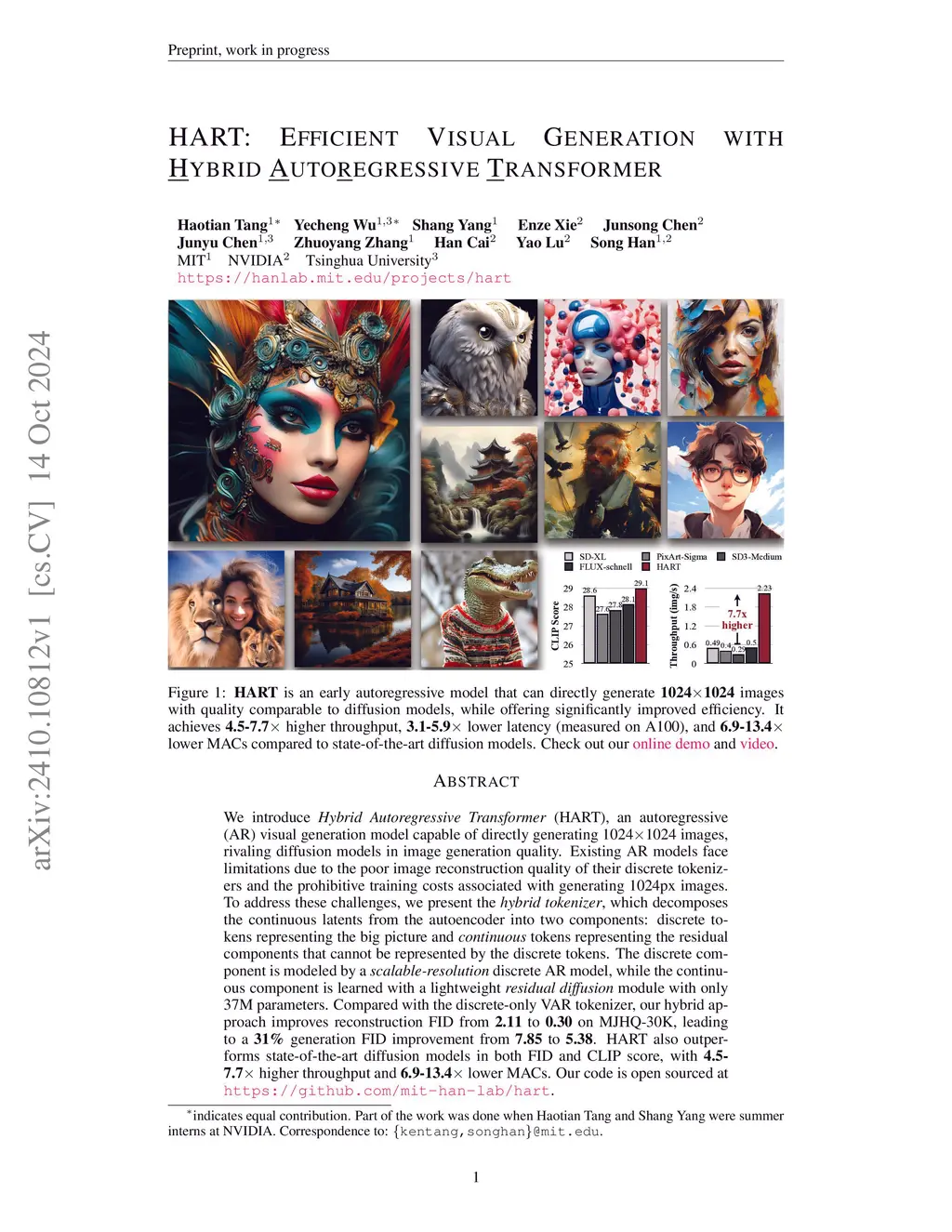 We introduce Hybrid Autoregressive Transformer (HART), an autoregressive (AR) visual generation model capable of directly generating 1024x1024 images, rivaling diffusion models in image generation quality. Existing AR models face limitations due to the poor image reconstruction quality of their discrete tokenizers and the prohibitive training costs associated with generating 1024px images. To address these challenges, we present the hybrid tokenizer, which decomposes the continuous latents from the autoencoder into two components: discrete tokens representing the big picture and continuous tokens representing the residual components that cannot be represented by the discrete tokens. The discrete component is modeled by a scalable-resolution discrete AR model, while the continuous component is learned with a lightweight residual diffusion module with only 37M parameters. Compared with the discrete-only VAR tokenizer, our hybrid approach improves reconstruction FID from 2.11 to 0.30 on MJHQ-30K, leading to a 31% generation FID improvement from 7.85 to 5.38. HART also outperforms state-of-the-art diffusion models in both FID and CLIP score, with 4.5-7.7x higher throughput and 6.9-13.4x lower MACs. Our code is open sourced at https://github.com/mit-han-lab/hart.
