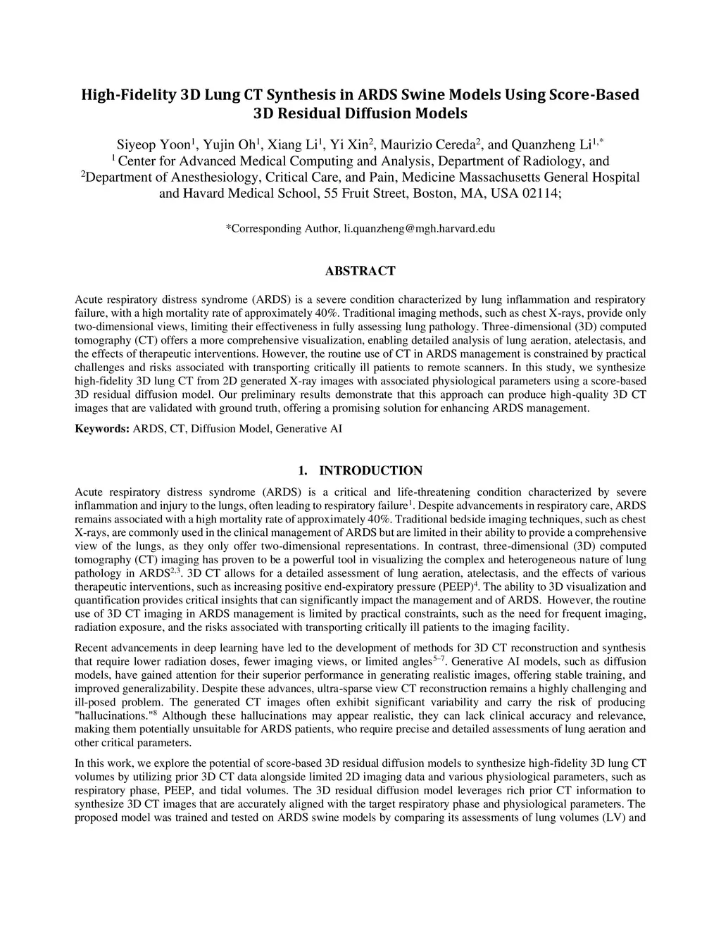 Acute respiratory distress syndrome (ARDS) is a severe condition characterized by lung inflammation and respiratory failure, with a high mortality rate of approximately 40%. Traditional imaging methods, such as chest X-rays, provide only two-dimensional views, limiting their effectiveness in fully assessing lung pathology. Three-dimensional (3D) computed tomography (CT) offers a more comprehensive visualization, enabling detailed analysis of lung aeration, atelectasis, and the effects of therapeutic interventions. However, the routine use of CT in ARDS management is constrained by practical challenges and risks associated with transporting critically ill patients to remote scanners. In this study, we synthesize high-fidelity 3D lung CT from 2D generated X-ray images with associated physiological parameters using a score-based 3D residual diffusion model. Our preliminary results demonstrate that this approach can produce high-quality 3D CT images that are validated with ground truth, offering a promising solution for enhancing ARDS management.
