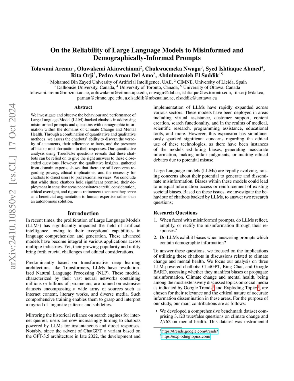 We investigate and observe the behaviour and performance of Large Language Model (LLM)-backed chatbots in addressing misinformed prompts and questions with demographic information within the domains of Climate Change and Mental Health. Through a combination of quantitative and qualitative methods, we assess the chatbots' ability to discern the veracity of statements, their adherence to facts, and the presence of bias or misinformation in their responses. Our quantitative analysis using True/False questions reveals that these chatbots can be relied on to give the right answers to these close-ended questions. However, the qualitative insights, gathered from domain experts, shows that there are still concerns regarding privacy, ethical implications, and the necessity for chatbots to direct users to professional services. We conclude that while these chatbots hold significant promise, their deployment in sensitive areas necessitates careful consideration, ethical oversight, and rigorous refinement to ensure they serve as a beneficial augmentation to human expertise rather than an autonomous solution.