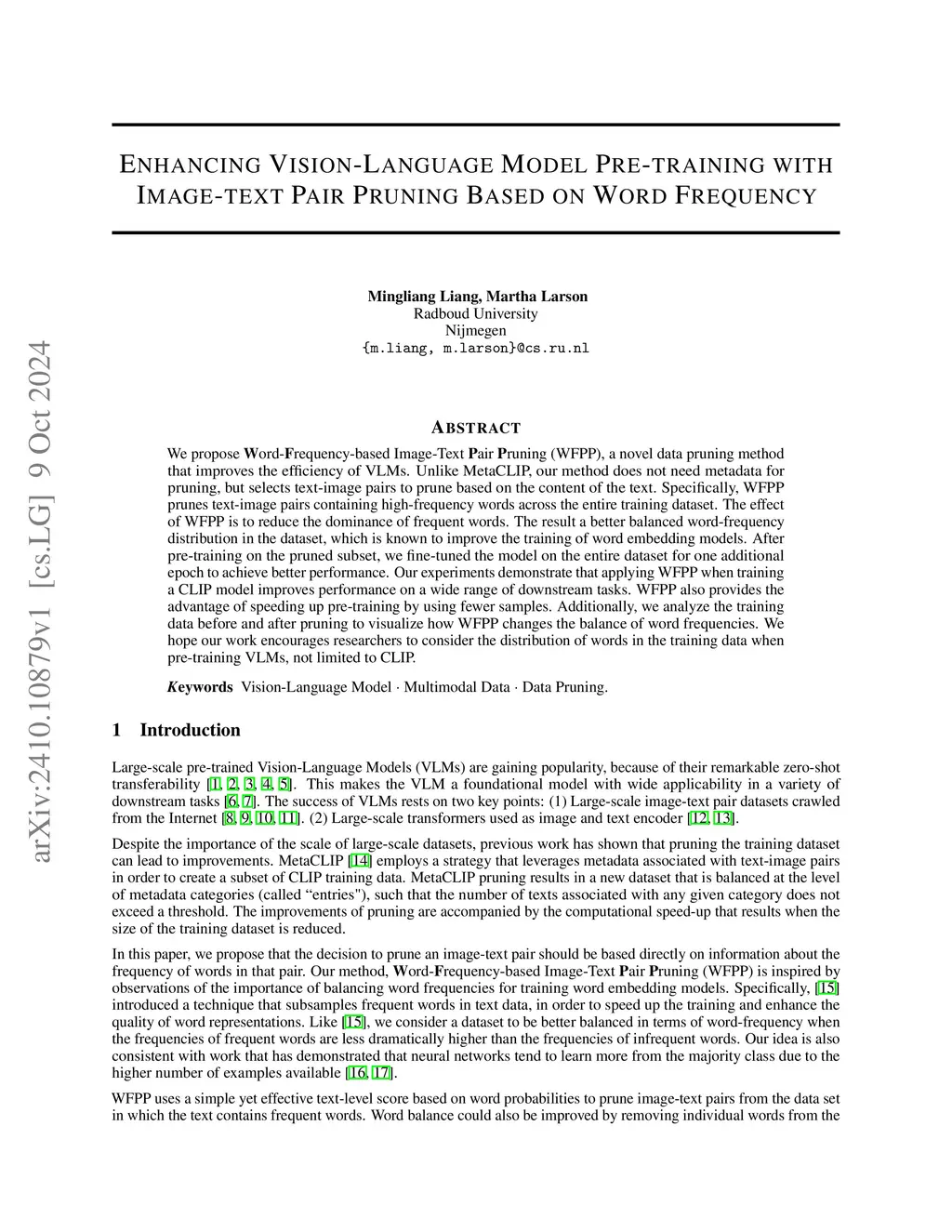 We propose Word-Frequency-based Image-Text Pair Pruning (WFPP), a novel data pruning method that improves the efficiency of VLMs. Unlike MetaCLIP, our method does not need metadata for pruning, but selects text-image pairs to prune based on the content of the text. Specifically, WFPP prunes text-image pairs containing high-frequency words across the entire training dataset. The effect of WFPP is to reduce the dominance of frequent words. The result a better balanced word-frequency distribution in the dataset, which is known to improve the training of word embedding models. After pre-training on the pruned subset, we fine-tuned the model on the entire dataset for one additional epoch to achieve better performance. Our experiments demonstrate that applying WFPP when training a CLIP model improves performance on a wide range of downstream tasks. WFPP also provides the advantage of speeding up pre-training by using fewer samples. Additionally, we analyze the training data before and after pruning to visualize how WFPP changes the balance of word frequencies. We hope our work encourages researchers to consider the distribution of words in the training data when pre-training VLMs, not limited to CLIP.