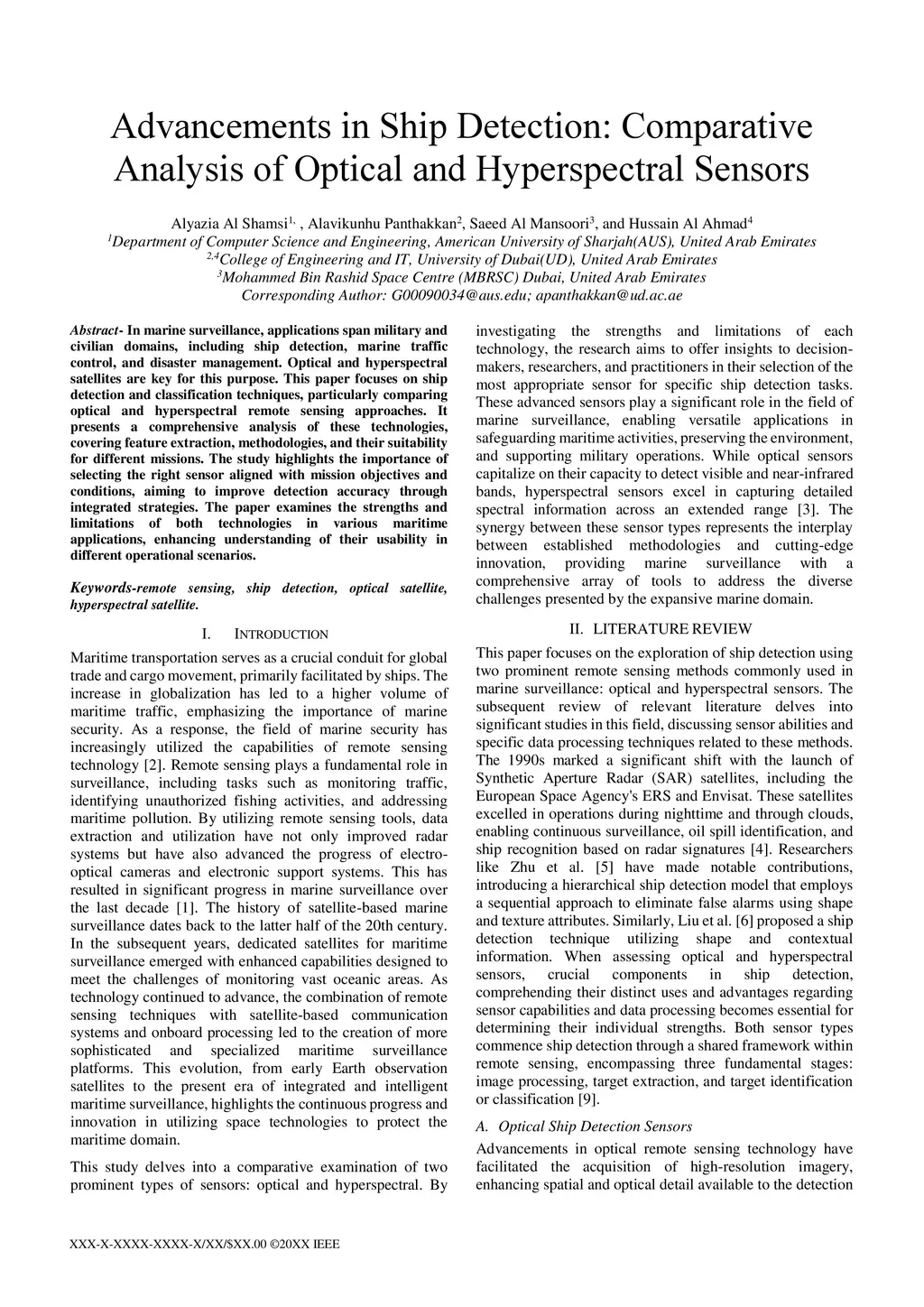 In marine surveillance, applications span military and civilian domains, including ship detection, marine traffic control, and disaster management. Optical and hyperspectral satellites are key for this purpose. This paper focuses on ship detection and classification techniques, particularly comparing optical and hyperspectral remote sensing approaches. It presents a comprehensive analysis of these technologies, covering feature extraction, methodologies, and their suitability for different missions. The study highlights the importance of selecting the right sensor aligned with mission objectives and conditions, aiming to improve detection accuracy through integrated strategies. The paper examines the strengths and limitations of both technologies in various maritime applications, enhancing understanding of their usability in different operational scenarios.