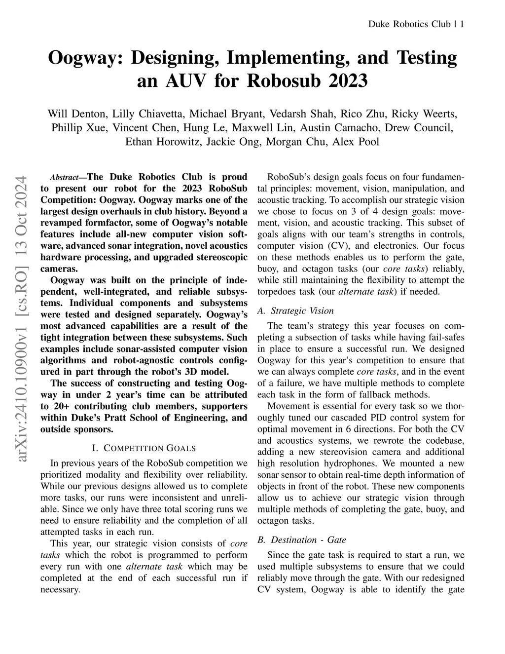 The Duke Robotics Club is proud to present our robot for the 2023 RoboSub Competition: Oogway. Oogway marks one of the largest design overhauls in club history. Beyond a revamped formfactor, some of Oogway's notable features include all-new computer vision software, advanced sonar integration, novel acoustics hardware processing, and upgraded stereoscopic cameras. Oogway was built on the principle of independent, well-integrated, and reliable subsystems. Individual components and subsystems were tested and designed separately. Oogway's most advanced capabilities are a result of the tight integration between these subsystems. Such examples include sonar-assisted computer vision algorithms and robot-agnostic controls configured in part through the robot's 3D model. The success of constructing and testing Oogway in under 2 year's time can be attributed to 20+ contributing club members, supporters within Duke's Pratt School of Engineering, and outside sponsors.