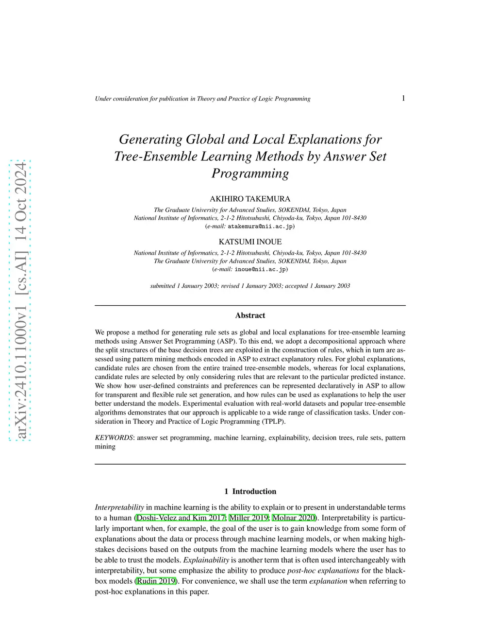 We propose a method for generating rule sets as global and local explanations for tree-ensemble learning methods using Answer Set Programming (ASP). To this end, we adopt a decompositional approach where the split structures of the base decision trees are exploited in the construction of rules, which in turn are assessed using pattern mining methods encoded in ASP to extract explanatory rules. For global explanations, candidate rules are chosen from the entire trained tree-ensemble models, whereas for local explanations, candidate rules are selected by only considering rules that are relevant to the particular predicted instance. We show how user-defined constraints and preferences can be represented declaratively in ASP to allow for transparent and flexible rule set generation, and how rules can be used as explanations to help the user better understand the models. Experimental evaluation with real-world datasets and popular tree-ensemble algorithms demonstrates that our approach is applicable to a wide range of classification tasks. Under consideration in Theory and Practice of Logic Programming (TPLP).