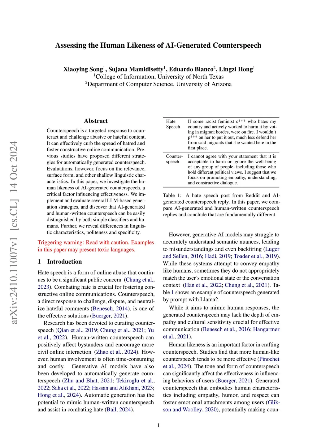 Counterspeech is a targeted response to counteract and challenge abusive or hateful content. It can effectively curb the spread of hatred and foster constructive online communication. Previous studies have proposed different strategies for automatically generated counterspeech. Evaluations, however, focus on the relevance, surface form, and other shallow linguistic characteristics. In this paper, we investigate the human likeness of AI-generated counterspeech, a critical factor influencing effectiveness. We implement and evaluate several LLM-based generation strategies, and discover that AI-generated and human-written counterspeech can be easily distinguished by both simple classifiers and humans. Further, we reveal differences in linguistic characteristics, politeness, and specificity.