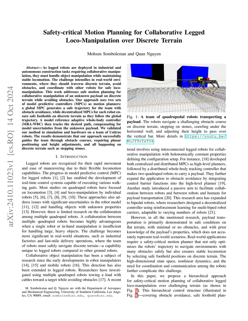 As legged robots are deployed in industrial and autonomous construction tasks requiring collaborative manipulation, they must handle object manipulation while maintaining stable locomotion. The challenge intensifies in real-world environments, where they should traverse discrete terrain, avoid obstacles, and coordinate with other robots for safe loco-manipulation. This work addresses safe motion planning for collaborative manipulation of an unknown payload on discrete terrain while avoiding obstacles. Our approach uses two sets of model predictive controllers (MPCs) as motion planners: a global MPC generates a safe trajectory for the team with obstacle avoidance, while decentralized MPCs for each robot ensure safe footholds on discrete terrain as they follow the global trajectory. A model reference adaptive whole-body controller (MRA-WBC) then tracks the desired path, compensating for model uncertainties from the unknown payload. We validated our method in simulation and hardware on a team of Unitree robots. The results demonstrate that our approach successfully guides the team through obstacle courses, requiring planar positioning and height adjustments, and all happening on discrete terrain such as stepping stones.