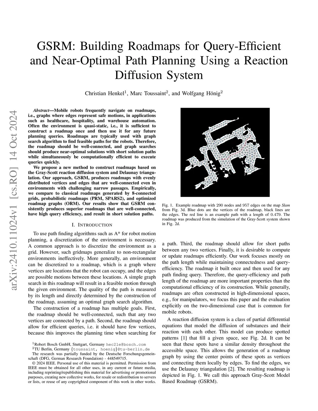 Mobile robots frequently navigate on roadmaps, i.e., graphs where edges represent safe motions, in applications such as healthcare, hospitality, and warehouse automation. Often the environment is quasi-static, i.e., it is sufficient to construct a roadmap once and then use it for any future planning queries. Roadmaps are typically used with graph search algorithm to find feasible paths for the robots. Therefore, the roadmap should be well-connected, and graph searches should produce near-optimal solutions with short solution paths while simultaneously be computationally efficient to execute queries quickly. We propose a new method to construct roadmaps based on the Gray-Scott reaction diffusion system and Delaunay triangulation. Our approach, GSRM, produces roadmaps with evenly distributed vertices and edges that are well-connected even in environments with challenging narrow passages. Empirically, we compare to classical roadmaps generated by 8-connected grids, probabilistic roadmaps (PRM, SPARS2), and optimized roadmap graphs (ORM). Our results show that GSRM consistently produces superior roadmaps that are well-connected, have high query efficiency, and result in short solution paths.