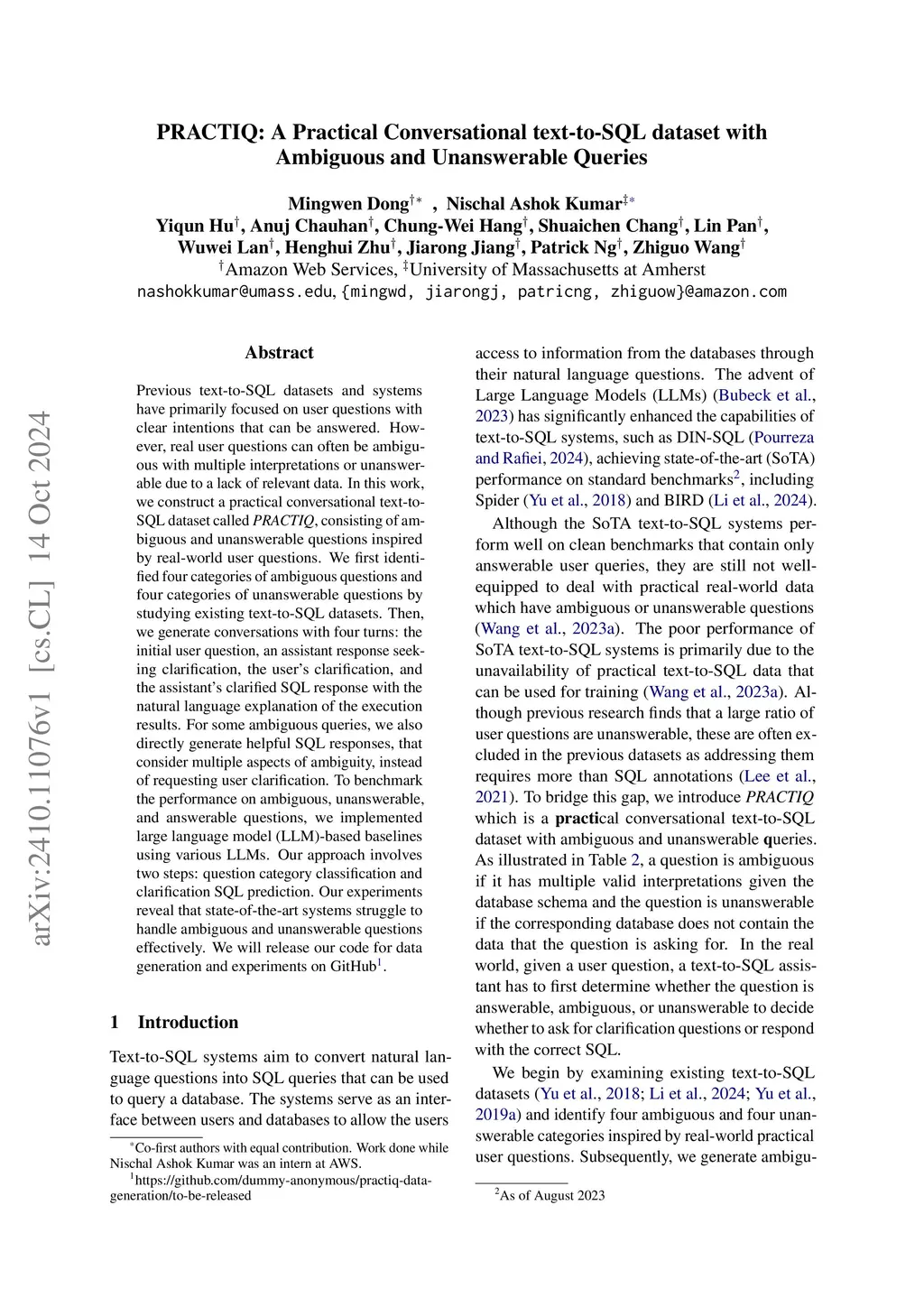 Previous text-to-SQL datasets and systems have primarily focused on user questions with clear intentions that can be answered. However, real user questions can often be ambiguous with multiple interpretations or unanswerable due to a lack of relevant data. In this work, we construct a practical conversational text-to-SQL dataset called PRACTIQ, consisting of ambiguous and unanswerable questions inspired by real-world user questions. We first identified four categories of ambiguous questions and four categories of unanswerable questions by studying existing text-to-SQL datasets. Then, we generate conversations with four turns: the initial user question, an assistant response seeking clarification, the user's clarification, and the assistant's clarified SQL response with the natural language explanation of the execution results. For some ambiguous queries, we also directly generate helpful SQL responses, that consider multiple aspects of ambiguity, instead of requesting user clarification. To benchmark the performance on ambiguous, unanswerable, and answerable questions, we implemented large language model (LLM)-based baselines using various LLMs. Our approach involves two steps: question category classification and clarification SQL prediction. Our experiments reveal that state-of-the-art systems struggle to handle ambiguous and unanswerable questions effectively. We will release our code for data generation and experiments on GitHub.