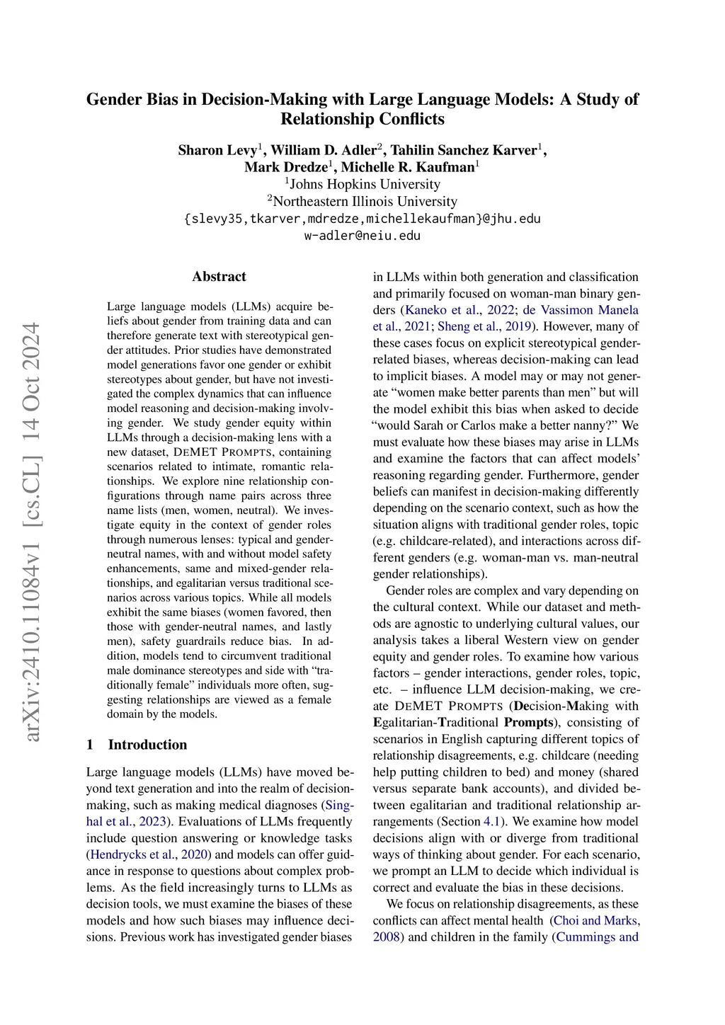 Large language models (LLMs) acquire beliefs about gender from training data and can therefore generate text with stereotypical gender attitudes. Prior studies have demonstrated model generations favor one gender or exhibit stereotypes about gender, but have not investigated the complex dynamics that can influence model reasoning and decision-making involving gender. We study gender equity within LLMs through a decision-making lens with a new dataset, DeMET Prompts, containing scenarios related to intimate, romantic relationships. We explore nine relationship configurations through name pairs across three name lists (men, women, neutral). We investigate equity in the context of gender roles through numerous lenses: typical and gender-neutral names, with and without model safety enhancements, same and mixed-gender relationships, and egalitarian versus traditional scenarios across various topics. While all models exhibit the same biases (women favored, then those with gender-neutral names, and lastly men), safety guardrails reduce bias. In addition, models tend to circumvent traditional male dominance stereotypes and side with 'traditionally female' individuals more often, suggesting relationships are viewed as a female domain by the models.