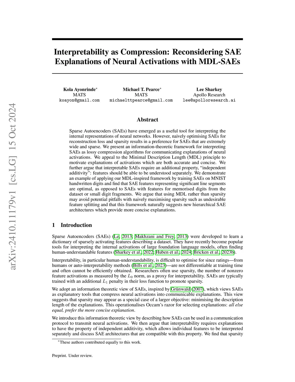 Sparse Autoencoders (SAEs) have emerged as a useful tool for interpreting the internal representations of neural networks. However, naively optimising SAEs for reconstruction loss and sparsity results in a preference for SAEs that are extremely wide and sparse. We present an information-theoretic framework for interpreting SAEs as lossy compression algorithms for communicating explanations of neural activations. We appeal to the Minimal Description Length (MDL) principle to motivate explanations of activations which are both accurate and concise. We further argue that interpretable SAEs require an additional property, "independent additivity": features should be able to be understood separately. We demonstrate an example of applying our MDL-inspired framework by training SAEs on MNIST handwritten digits and find that SAE features representing significant line segments are optimal, as opposed to SAEs with features for memorised digits from the dataset or small digit fragments. We argue that using MDL rather than sparsity may avoid potential pitfalls with naively maximising sparsity such as undesirable feature splitting and that this framework naturally suggests new hierarchical SAE architectures which provide more concise explanations.