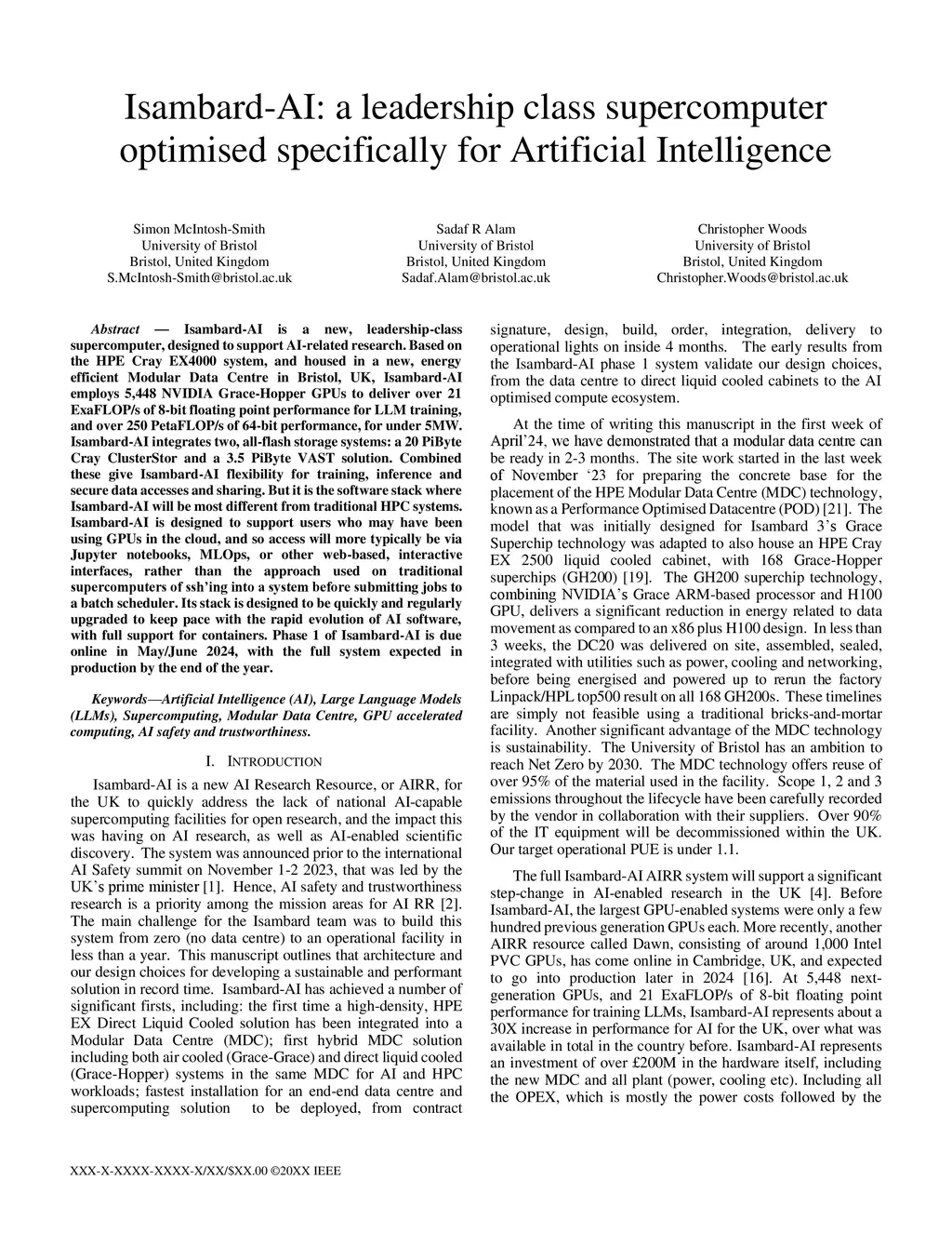 Isambard-AI is a new, leadership-class supercomputer, designed to support AI-related research. Based on the HPE Cray EX4000 system, and housed in a new, energy efficient Modular Data Centre in Bristol, UK, Isambard-AI employs 5,448 NVIDIA Grace-Hopper GPUs to deliver over 21 ExaFLOP/s of 8-bit floating point performance for LLM training, and over 250 PetaFLOP/s of 64-bit performance, for under 5MW. Isambard-AI integrates two, all-flash storage systems: a 20 PiByte Cray ClusterStor and a 3.5 PiByte VAST solution. Combined these give Isambard-AI flexibility for training, inference and secure data accesses and sharing. But it is the software stack where Isambard-AI will be most different from traditional HPC systems. Isambard-AI is designed to support users who may have been using GPUs in the cloud, and so access will more typically be via Jupyter notebooks, MLOps, or other web-based, interactive interfaces, rather than the approach used on traditional supercomputers of sshing into a system before submitting jobs to a batch scheduler. Its stack is designed to be quickly and regularly upgraded to keep pace with the rapid evolution of AI software, with full support for containers. Phase 1 of Isambard-AI is due online in May/June 2024, with the full system expected in production by the end of the year.