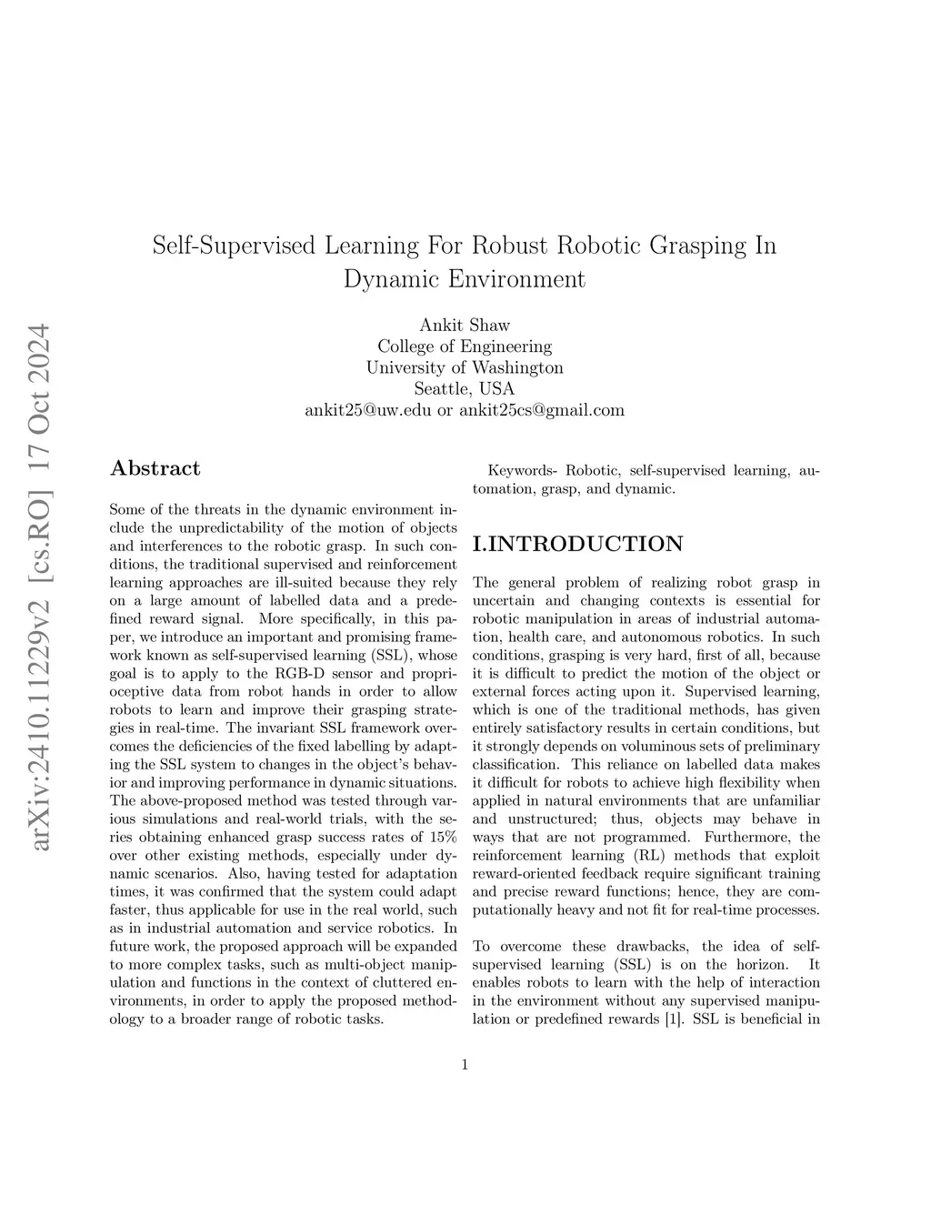Some of the threats in the dynamic environment include the unpredictability of the motion of objects and interferences to the robotic grasp. In such conditions the traditional supervised and reinforcement learning approaches are ill suited because they rely on a large amount of labelled data and a predefined reward signal. More specifically in this paper we introduce an important and promising framework known as self supervised learning (SSL) whose goal is to apply to the RGBD sensor and proprioceptive data from robot hands in order to allow robots to learn and improve their grasping strategies in real time. The invariant SSL framework overcomes the deficiencies of the fixed labelling by adapting the SSL system to changes in the objects behavior and improving performance in dynamic situations. The above proposed method was tested through various simulations and real world trials, with the series obtaining enhanced grasp success rates of 15% over other existing methods, especially under dynamic scenarios. Also, having tested for adaptation times, it was confirmed that the system could adapt faster, thus applicable for use in the real world, such as in industrial automation and service robotics. In future work, the proposed approach will be expanded to more complex tasks, such as multi object manipulation and functions in the context of cluttered environments, in order to apply the proposed methodology to a broader range of robotic tasks.