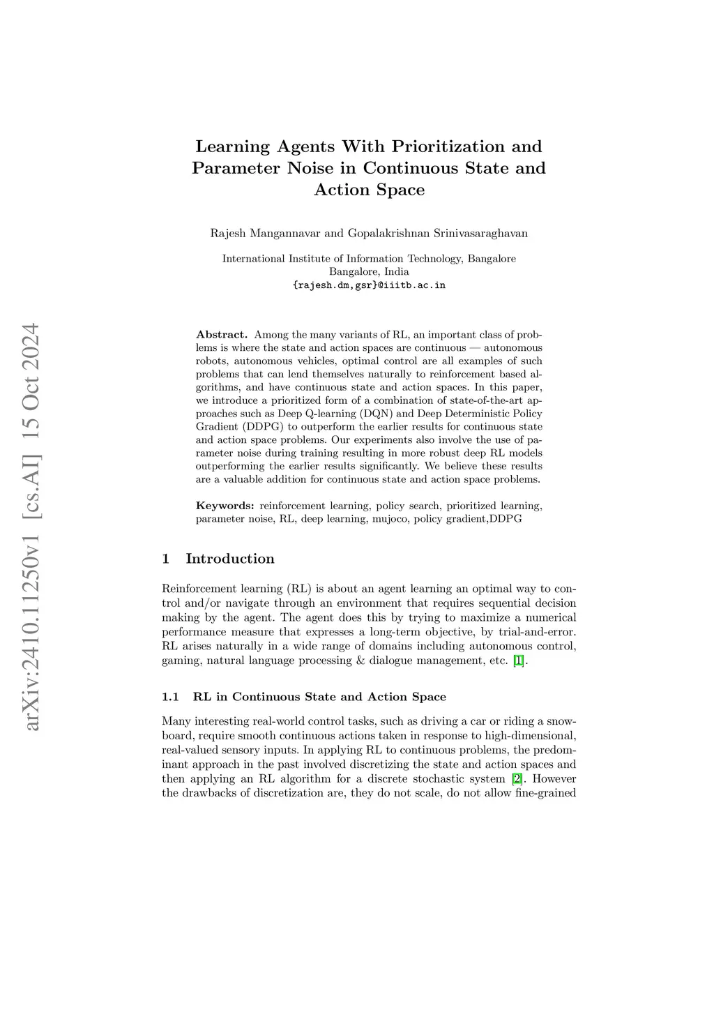 Among the many variants of RL, an important class of problems is where the state and action spaces are continuous -- autonomous robots, autonomous vehicles, optimal control are all examples of such problems that can lend themselves naturally to reinforcement based algorithms, and have continuous state and action spaces. In this paper, we introduce a prioritized form of a combination of state-of-the-art approaches such as Deep Q-learning (DQN) and Deep Deterministic Policy Gradient (DDPG) to outperform the earlier results for continuous state and action space problems. Our experiments also involve the use of parameter noise during training resulting in more robust deep RL models outperforming the earlier results significantly. We believe these results are a valuable addition for continuous state and action space problems.