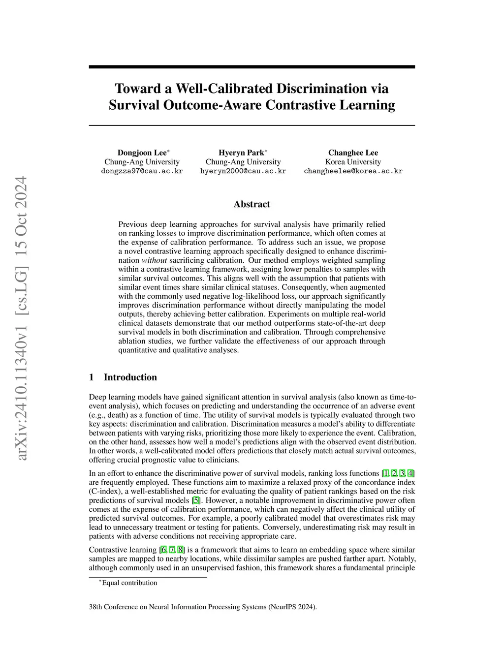 Previous deep learning approaches for survival analysis have primarily relied on ranking losses to improve discrimination performance, which often comes at the expense of calibration performance. To address such an issue, we propose a novel contrastive learning approach specifically designed to enhance discrimination \textit{without} sacrificing calibration. Our method employs weighted sampling within a contrastive learning framework, assigning lower penalties to samples with similar survival outcomes. This aligns well with the assumption that patients with similar event times share similar clinical statuses. Consequently, when augmented with the commonly used negative log-likelihood loss, our approach significantly improves discrimination performance without directly manipulating the model outputs, thereby achieving better calibration. Experiments on multiple real-world clinical datasets demonstrate that our method outperforms state-of-the-art deep survival models in both discrimination and calibration. Through comprehensive ablation studies, we further validate the effectiveness of our approach through quantitative and qualitative analyses.