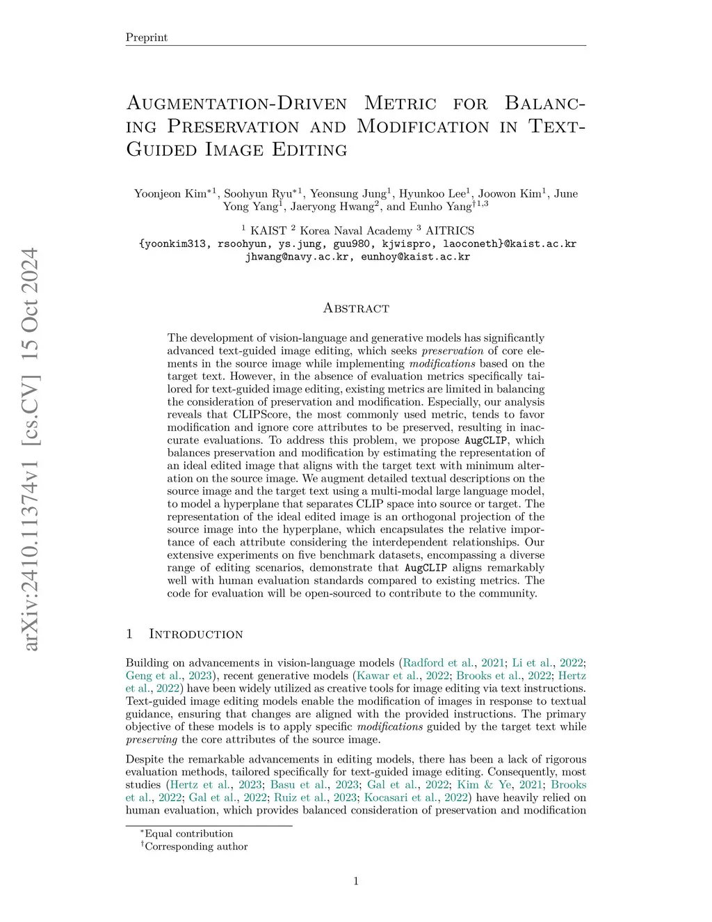 The development of vision-language and generative models has significantly advanced text-guided image editing, which seeks the preservation of core elements in the source image while implementing modifications based on the target text. However, existing metrics have a context-blindness problem, indiscriminately applying the same evaluation criteria on completely different pairs of source image and target text, biasing towards either modification or preservation. Directional CLIP similarity, the only metric that considers both source image and target text, is also biased towards modification aspects and attends to irrelevant editing regions of the image. We propose AugCLIP, a context-aware metric that adaptively coordinates preservation and modification aspects, depending on the specific context of a given source image and target text. This is done by deriving the CLIP representation of an ideally edited image, that preserves the source image with necessary modifications to align with target text. More specifically, using a multi-modal large language model, AugCLIP augments the textual descriptions of the source and target, then calculates a modification vector through a hyperplane that separates source and target attributes in CLIP space. Extensive experiments on five benchmark datasets, encompassing a diverse range of editing scenarios, show that AugCLIP aligns remarkably well with human evaluation standards, outperforming existing metrics. The code is available atthis https URL.