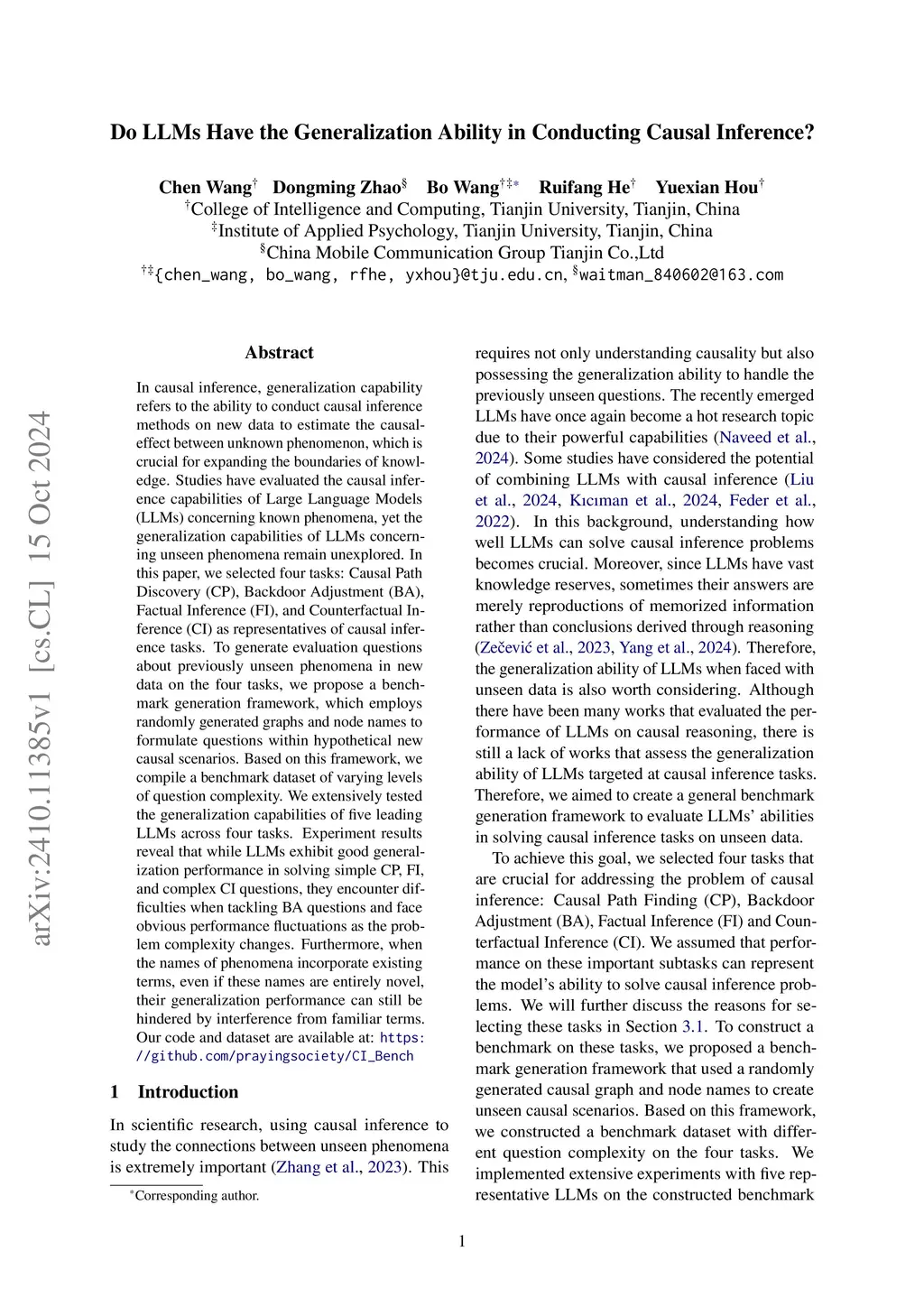 In causal inference, generalization capability refers to the ability to conduct causal inference methods on new data to estimate the causal-effect between unknown phenomenon, which is crucial for expanding the boundaries of knowledge. Studies have evaluated the causal inference capabilities of Large Language Models (LLMs) concerning known phenomena, yet the generalization capabilities of LLMs concerning unseen phenomena remain unexplored. In this paper, we selected four tasks: Causal Path Discovery (CP), Backdoor Adjustment (BA), Factual Inference (FI), and Counterfactual Inference (CI) as representatives of causal inference tasks. To generate evaluation questions about previously unseen phenomena in new data on the four tasks, we propose a benchmark generation framework, which employs randomly generated graphs and node names to formulate questions within hypothetical new causal scenarios. Based on this framework, we compile a benchmark dataset of varying levels of question complexity. We extensively tested the generalization capabilities of five leading LLMs across four tasks. Experiment results reveal that while LLMs exhibit good generalization performance in solving simple CP, FI, and complex CI questions, they encounter difficulties when tackling BA questions and face obvious performance fluctuations as the problem complexity changes. Furthermore, when the names of phenomena incorporate existing terms, even if these names are entirely novel, their generalization performance can still be hindered by interference from familiar terms.