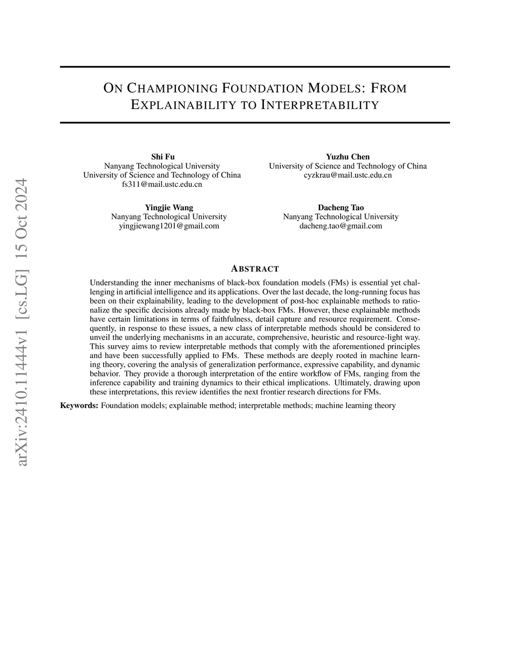 Understanding the inner mechanisms of black-box foundation models (FMs) is essential yet challenging in artificial intelligence and its applications. Over the last decade, the long-running focus has been on their explainability, leading to the development of post-hoc explainable methods to rationalize the specific decisions already made by black-box FMs. However, these explainable methods have certain limitations in terms of faithfulness and resource requirement. Consequently, a new class of interpretable methods should be considered to unveil the underlying mechanisms of FMs in an accurate, comprehensive, heuristic, and resource-light way. This survey aims to review those interpretable methods that comply with the aforementioned principles and have been successfully applied to FMs. These methods are deeply rooted in machine learning theory, covering the analysis of generalization performance, expressive capability, and dynamic behavior. They provide a thorough interpretation of the entire workflow of FMs, ranging from the inference capability and training dynamics to their ethical implications. Ultimately, drawing upon these interpretations, this review identifies the next frontier research directions for FMs.