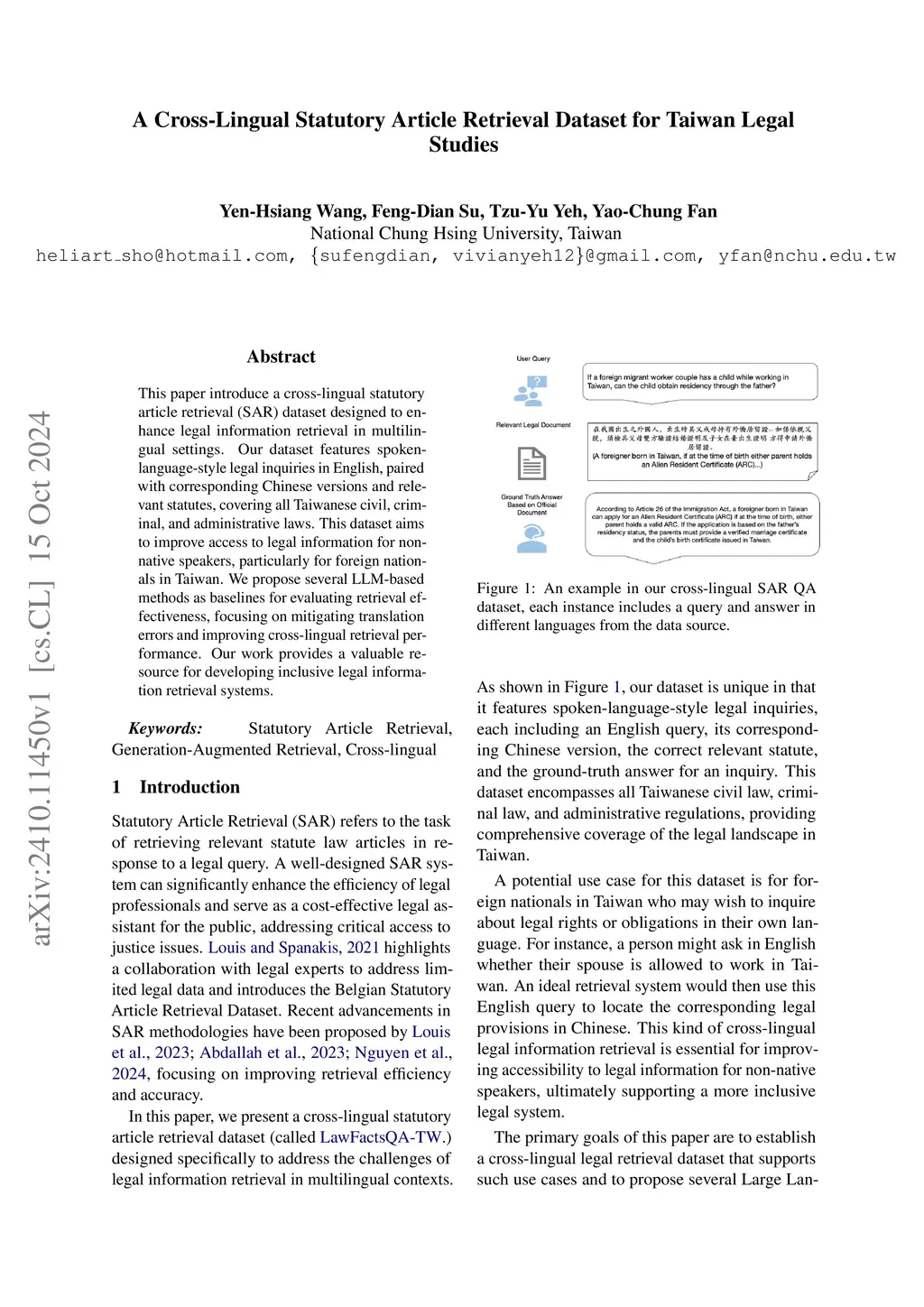 This paper introduces a cross-lingual statutory article retrieval (SAR) dataset designed to enhance legal information retrieval in multilingual settings. Our dataset features spoken-language-style legal inquiries in English, paired with corresponding Chinese versions and relevant statutes, covering all Taiwanese civil, criminal, and administrative laws. This dataset aims to improve access to legal information for non-native speakers, particularly for foreign nationals in Taiwan. We propose several LLM-based methods as baselines for evaluating retrieval effectiveness, focusing on mitigating translation errors and improving cross-lingual retrieval performance. Our work provides a valuable resource for developing inclusive legal information retrieval systems.