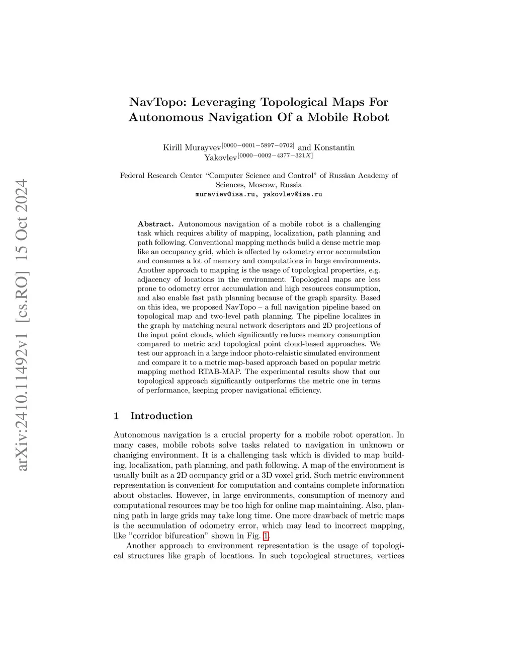 Autonomous navigation of a mobile robot is a challenging task which requires ability of mapping, localization, path planning and path following. Conventional mapping methods build a dense metric map like an occupancy grid, which is affected by odometry error accumulation and consumes a lot of memory and computations in large environments. Another approach to mapping is the usage of topological properties, e.g. adjacency of locations in the environment. Topological maps are less prone to odometry error accumulation and high resources consumption, and also enable fast path planning because of the graph sparsity. Based on this idea, we proposed NavTopo - a full navigation pipeline based on topological map and two-level path planning. The pipeline localizes in the graph by matching neural network descriptors and 2D projections of the input point clouds, which significantly reduces memory consumption compared to metric and topological point cloud-based approaches. We test our approach in a large indoor photo-relaistic simulated environment and compare it to a metric map-based approach based on popular metric mapping method RTAB-MAP. The experimental results show that our topological approach significantly outperforms the metric one in terms of performance, keeping proper navigational efficiency.