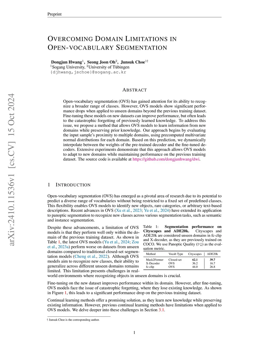 Open-Vocabulary Segmentation (OVS) aims to segment classes that are not present in the training dataset. However, most existing studies assume that the training data is fixed in advance, overlooking more practical scenarios where new datasets are continuously collected over time. To address this, we first analyze how existing OVS models perform under such conditions. In this context, we explore several approaches such as retraining, fine-tuning, and continual learning but find that each of them has clear limitations. To address these issues, we propose ConOVS, a novel continual learning method based on a Mixture-of-Experts framework. ConOVS dynamically combines expert decoders based on the probability that an input sample belongs to the distribution of each incremental dataset. Through extensive experiments, we show that ConOVS consistently outperforms existing methods across pre-training, incremental, and zero-shot test datasets, effectively expanding the recognition capabilities of OVS models when data is collected sequentially.