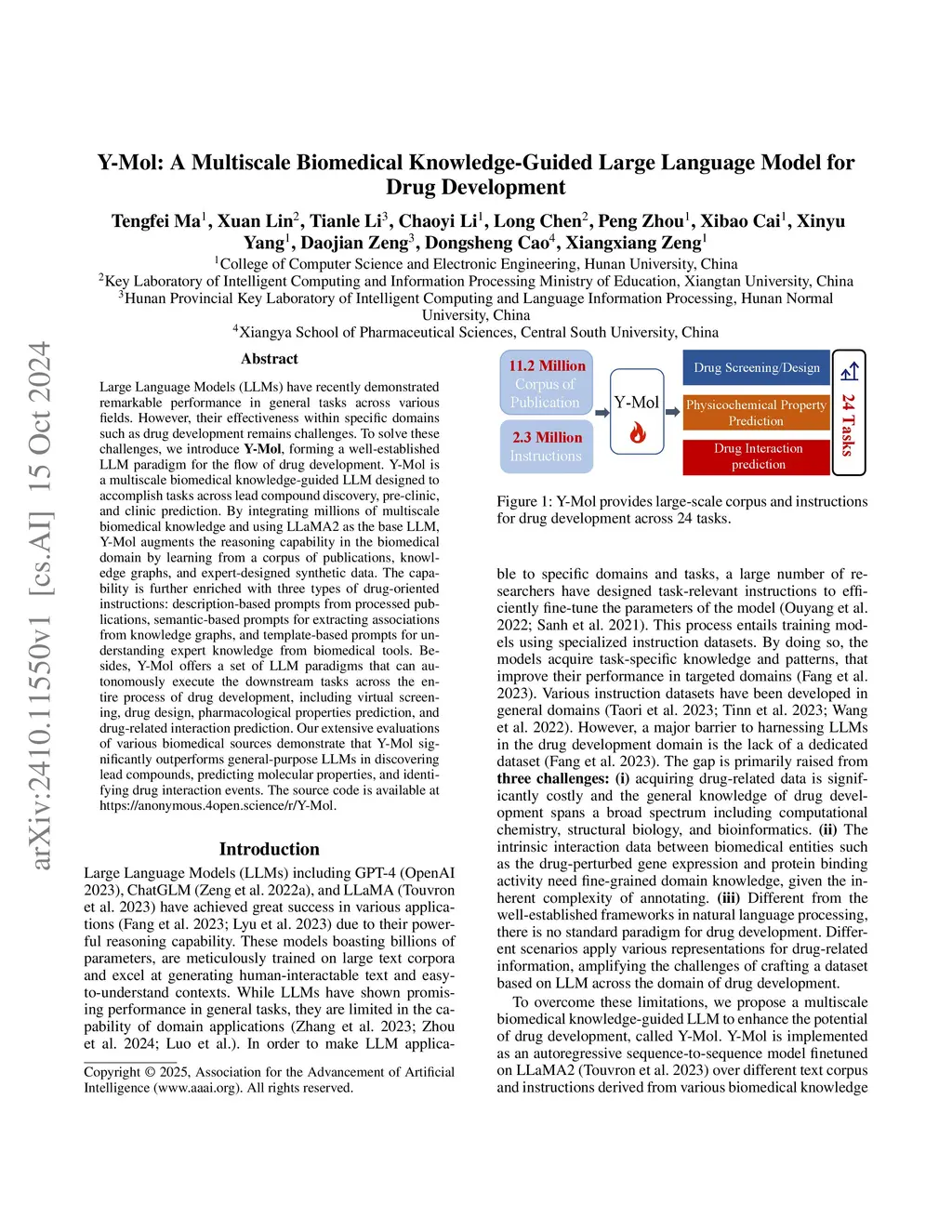 Large Language Models (LLMs) have recently demonstrated remarkable performance in general tasks across various fields. However, their effectiveness within specific domains such as drug development remains challenges. To solve these challenges, we introduce \textbf{Y-Mol}, forming a well-established LLM paradigm for the flow of drug development. Y-Mol is a multiscale biomedical knowledge-guided LLM designed to accomplish tasks across lead compound discovery, pre-clinic, and clinic prediction. By integrating millions of multiscale biomedical knowledge and using LLaMA2 as the base LLM, Y-Mol augments the reasoning capability in the biomedical domain by learning from a corpus of publications, knowledge graphs, and expert-designed synthetic data. The capability is further enriched with three types of drug-oriented instructions: description-based prompts from processed publications, semantic-based prompts for extracting associations from knowledge graphs, and template-based prompts for understanding expert knowledge from biomedical tools. Besides, Y-Mol offers a set of LLM paradigms that can autonomously execute the downstream tasks across the entire process of drug development, including virtual screening, drug design, pharmacological properties prediction, and drug-related interaction prediction. Our extensive evaluations of various biomedical sources demonstrate that Y-Mol significantly outperforms general-purpose LLMs in discovering lead compounds, predicting molecular properties, and identifying drug interaction events.