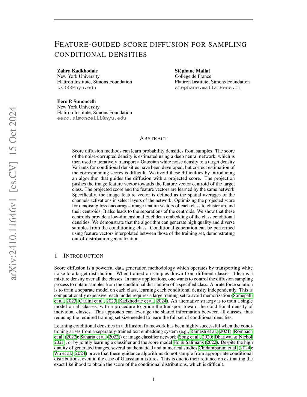 Score diffusion methods can learn probability densities from samples. The score of the noise-corrupted density is estimated using a deep neural network, which is then used to iteratively transport a Gaussian white noise density to a target density. Variants for conditional densities have been developed, but correct estimation of the corresponding scores is difficult. We avoid these difficulties by introducing an algorithm that guides the diffusion with a projected score. The projection pushes the image feature vector towards the feature vector centroid of the target class. The projected score and the feature vectors are learned by the same network. Specifically, the image feature vector is defined as the spatial averages of the channels activations in select layers of the network. Optimizing the projected score for denoising loss encourages image feature vectors of each class to cluster around their centroids. It also leads to the separations of the centroids. We show that these centroids provide a low-dimensional Euclidean embedding of the class conditional densities. We demonstrate that the algorithm can generate high quality and diverse samples from the conditioning class. Conditional generation can be performed using feature vectors interpolated between those of the training set, demonstrating out-of-distribution generalization.