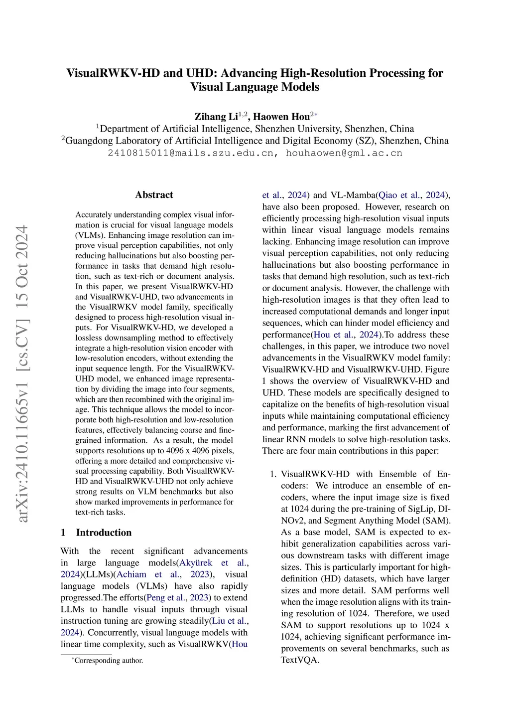 Accurately understanding complex visual information is crucial for visual language models (VLMs). Enhancing image resolution can improve visual perception capabilities, not only reducing hallucinations but also boosting performance in tasks that demand high resolution, such as text-rich or document analysis. In this paper, we present VisualRWKV-HD and VisualRWKV-UHD, two advancements in the VisualRWKV model family, specifically designed to process high-resolution visual inputs. For VisualRWKV-HD, we developed a lossless downsampling method to effectively integrate a high-resolution vision encoder with low-resolution encoders, without extending the input sequence length. For the VisualRWKV-UHD model, we enhanced image representation by dividing the image into four segments, which are then recombined with the original image. This technique allows the model to incorporate both high-resolution and low-resolution features, effectively balancing coarse and fine-grained information. As a result, the model supports resolutions up to 4096 x 4096 pixels, offering a more detailed and comprehensive visual processing capability. Both VisualRWKV-HD and VisualRWKV-UHD not only achieve strong results on VLM benchmarks but also show marked improvements in performance for text-rich tasks.