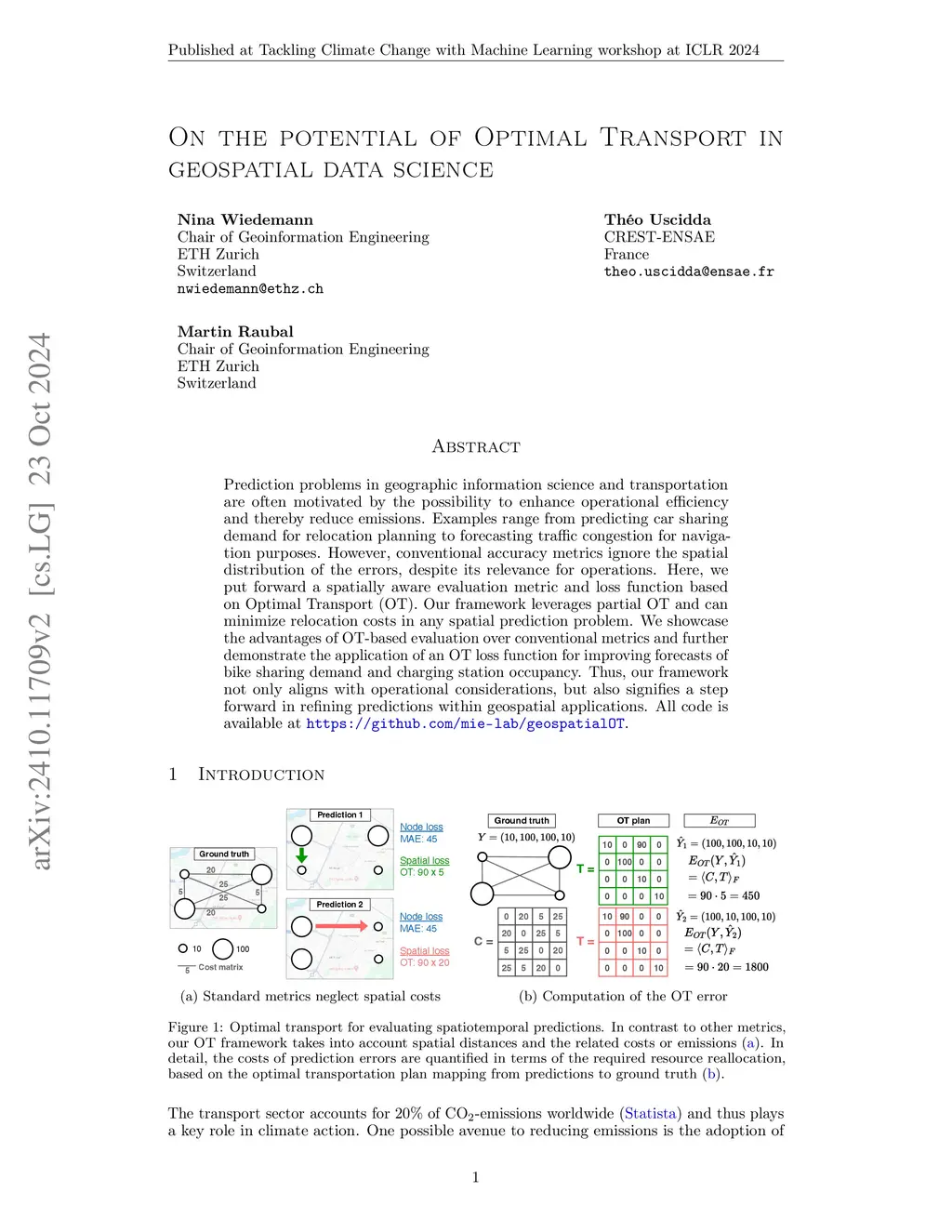 When predicting observations across space and time, the spatial layout of errors impacts a model's real-world utility. For instance, in bike sharing demand prediction, error patterns translate to relocation costs. However, commonly used error metrics in GeoAI evaluate predictions point-wise, neglecting effects such as spatial heterogeneity, autocorrelation, and the Modifiable Areal Unit Problem. We put forward Optimal Transport (OT) as a spatial evaluation metric and loss function. The proposed framework, called GeOT, assesses the performance of prediction models by quantifying the transport costs associated with their prediction errors. Through experiments on real and synthetic data, we demonstrate that 1) the spatial distribution of prediction errors relates to real-world costs in many applications, 2) OT captures these spatial costs more accurately than existing metrics, and 3) OT enhances comparability across spatial and temporal scales. Finally, we advocate for leveraging OT as a loss function in neural networks to improve the spatial accuracy of predictions. Experiments with bike sharing, charging station, and traffic datasets show that spatial costs are significantly reduced with only marginal changes to non-spatial error metrics. Thus, this approach not only offers a spatially explicit tool for model evaluation and selection, but also integrates spatial considerations into model training. All code is available atthis https URL.