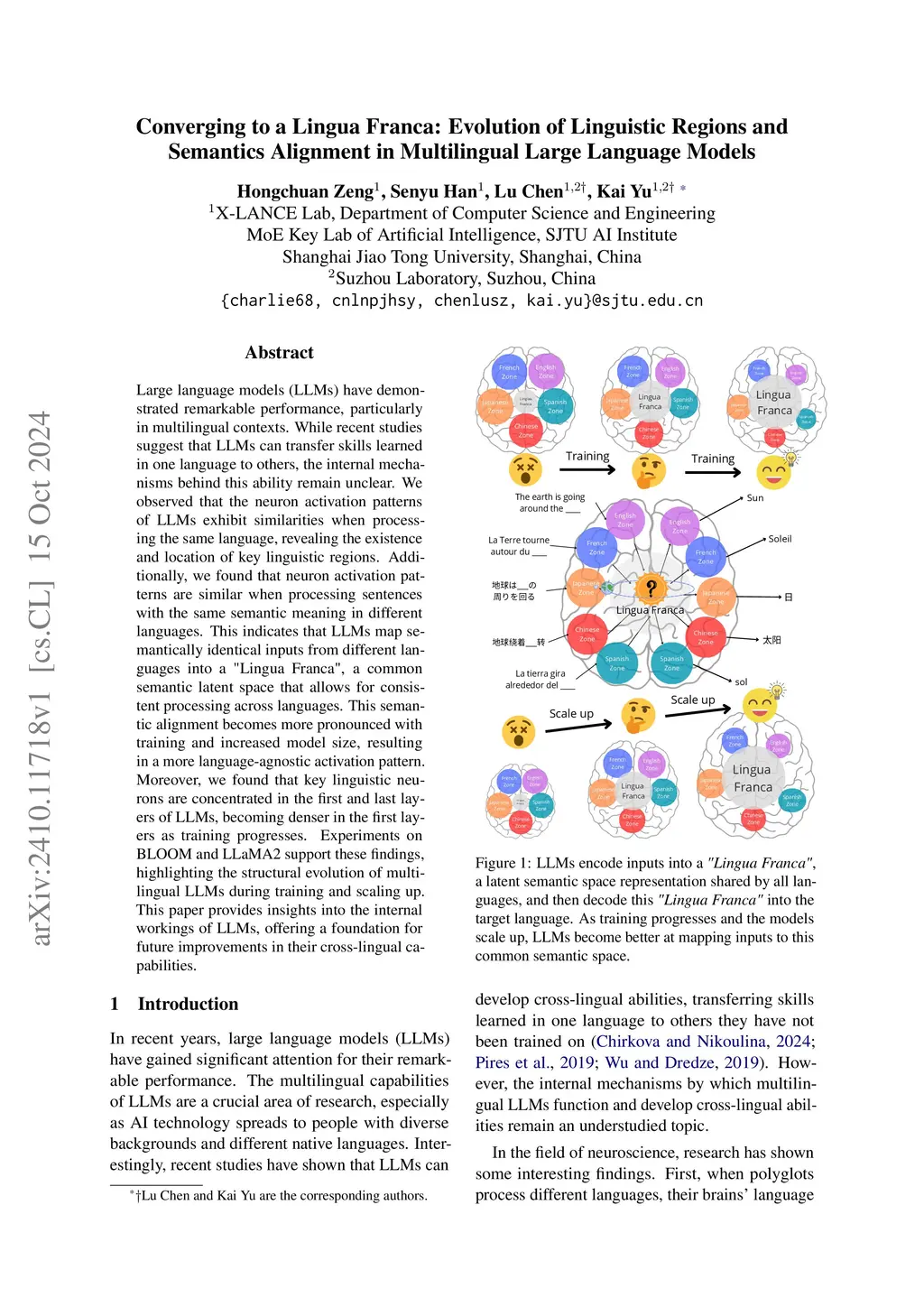 Large language models (LLMs) have demonstrated remarkable performance, particularly in multilingual contexts. While recent studies suggest that LLMs can transfer skills learned in one language to others, the internal mechanisms behind this ability remain unclear. We observed that the neuron activation patterns of LLMs exhibit similarities when processing the same language, revealing the existence and location of key linguistic regions. Additionally, we found that neuron activation patterns are similar when processing sentences with the same semantic meaning in different languages. This indicates that LLMs map semantically identical inputs from different languages into a "Lingua Franca", a common semantic latent space that allows for consistent processing across languages. This semantic alignment becomes more pronounced with training and increased model size, resulting in a more language-agnostic activation pattern. Moreover, we found that key linguistic neurons are concentrated in the first and last layers of LLMs, becoming denser in the first layers as training progresses. Experiments on BLOOM and LLaMA2 support these findings, highlighting the structural evolution of multilingual LLMs during training and scaling up. This paper provides insights into the internal workings of LLMs, offering a foundation for future improvements in their cross-lingual capabilities.