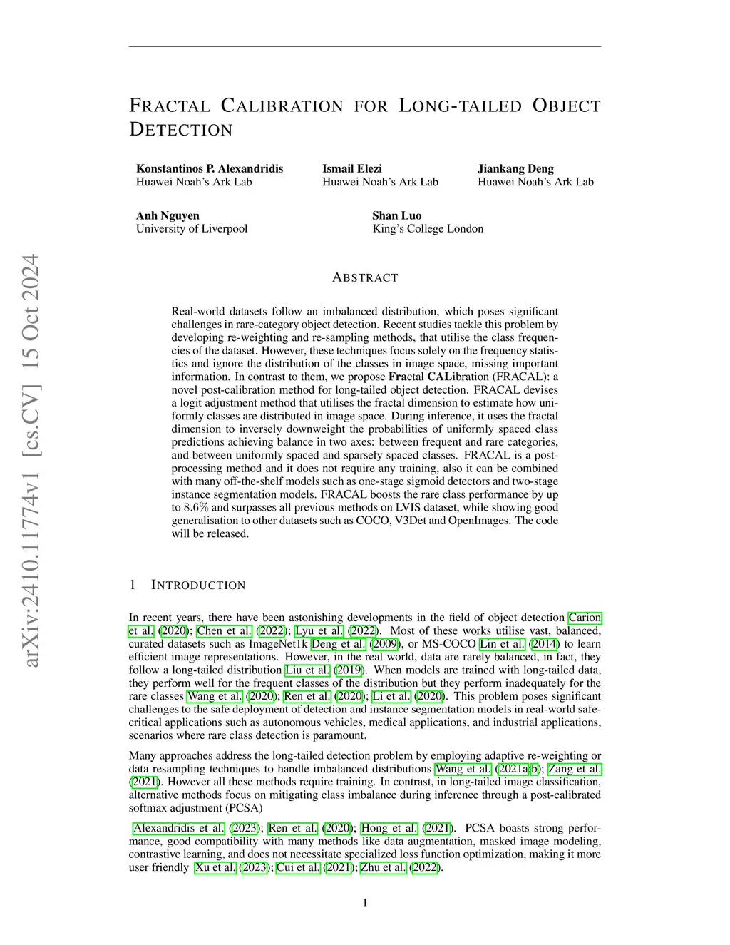 Real-world datasets follow an imbalanced distribution, which poses significant challenges in rare-category object detection. Recent studies tackle this problem by developing re-weighting and re-sampling methods, that utilise the class frequencies of the dataset. However, these techniques focus solely on the frequency statistics and ignore the distribution of the classes in image space, missing important information. In contrast to them, we propose FRActal CALibration (FRACAL): a novel post-calibration method for long-tailed object detection. FRACAL devises a logit adjustment method that utilises the fractal dimension to estimate how uniformly classes are distributed in image space. During inference, it uses the fractal dimension to inversely downweight the probabilities of uniformly spaced class predictions achieving balance in two axes: between frequent and rare categories, and between uniformly spaced and sparsely spaced classes. FRACAL is a post-processing method and it does not require any training, also it can be combined with many off-the-shelf models such as one-stage sigmoid detectors and two-stage instance segmentation models. FRACAL boosts the rare class performance by up to 8.6% and surpasses all previous methods on LVIS dataset, while showing good generalisation to other datasets such as COCO, V3Det and OpenImages. We provide the code atthis https URL.