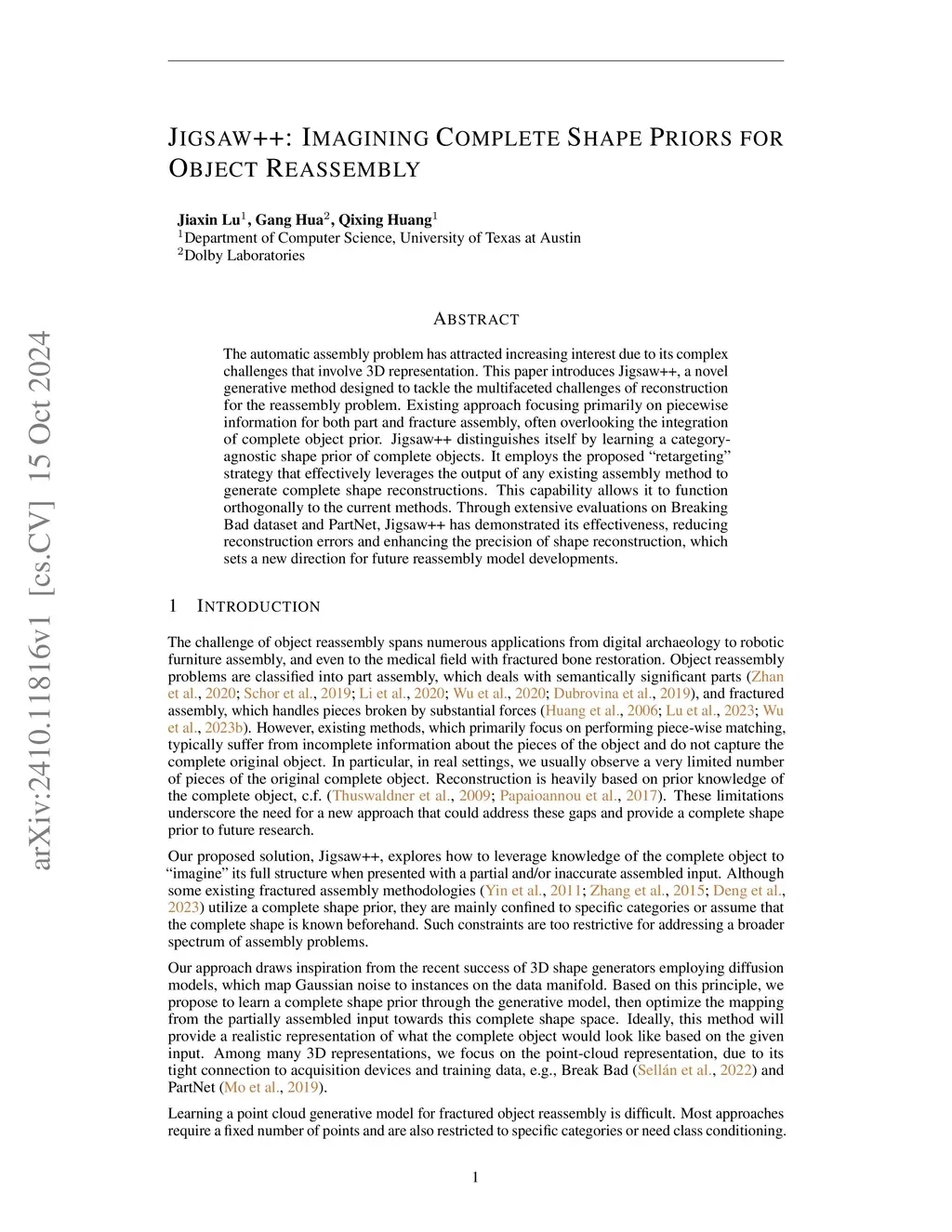The automatic assembly problem has attracted increasing interest due to its complex challenges that involve 3D representation. This paper introduces Jigsaw++, a novel generative method designed to tackle the multifaceted challenges of reconstructing complete shape for the reassembly problem. Existing approach focusing primarily on piecewise information for both part and fracture assembly, often overlooking the integration of complete object prior. Jigsaw++ distinguishes itself by learning a shape prior of complete objects. It employs the proposed "retargeting" strategy that effectively leverages the output of any existing assembly method to generate complete shape reconstructions. This capability allows it to function orthogonally to the current methods. Through extensive evaluations on Breaking Bad dataset and PartNet, Jigsaw++ has demonstrated its effectiveness, reducing reconstruction errors and enhancing the precision of shape reconstruction, which sets a new direction for future reassembly model developments.